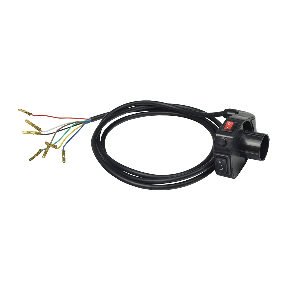 Handlebar-mounted switch cluster for headlight, turn signals, and horn with 7 wires. Use with your existing handlebar grip. Fits standard 7/8" diameter handlebars. Actual design may vary - for example, switch rockers could be red or black, switches may be labeled or unlabeled, etc.
