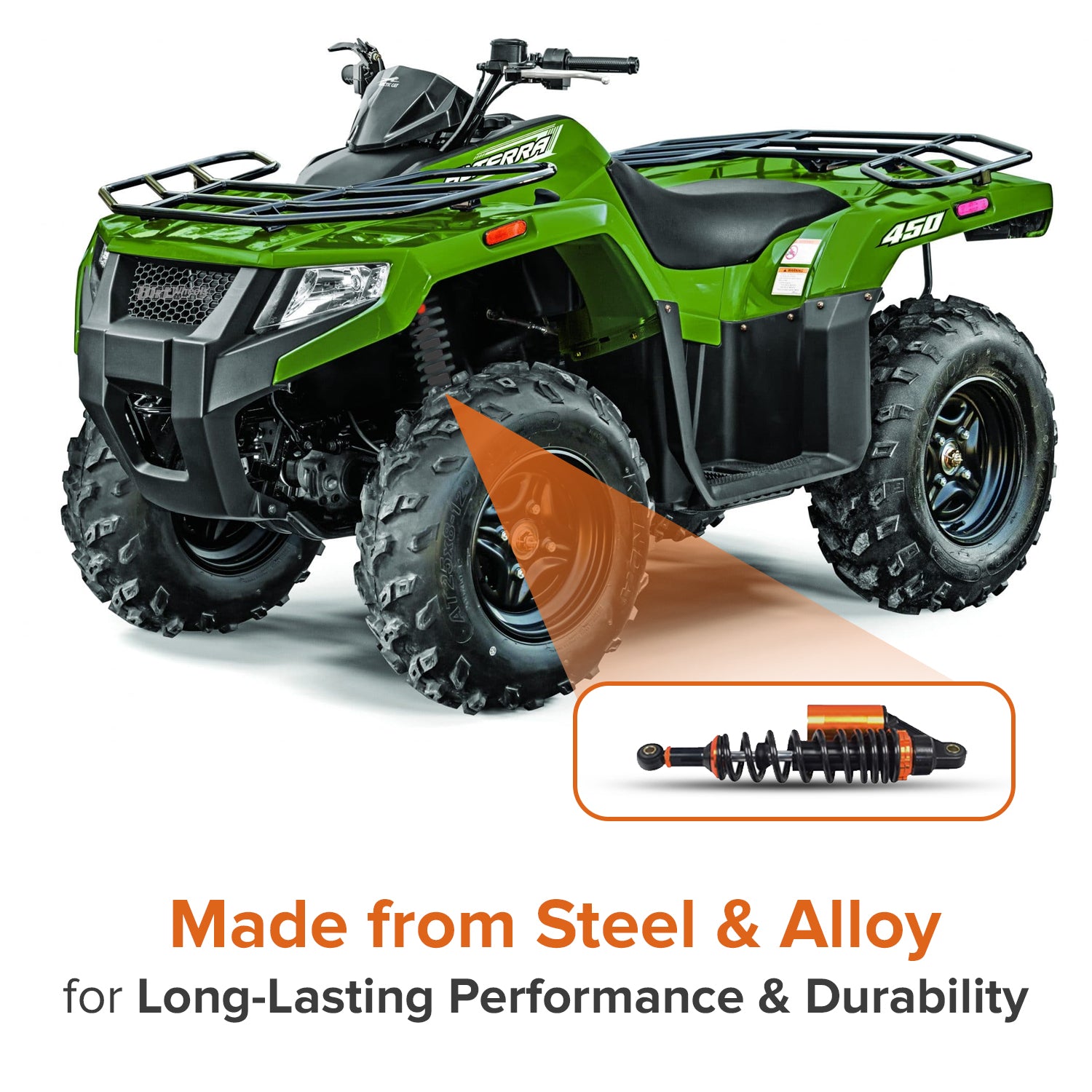 These steel and alloy shock absorbers feature a black case and springs with orange highlights and they will look especially good mounted on almost any powersports vehicle.