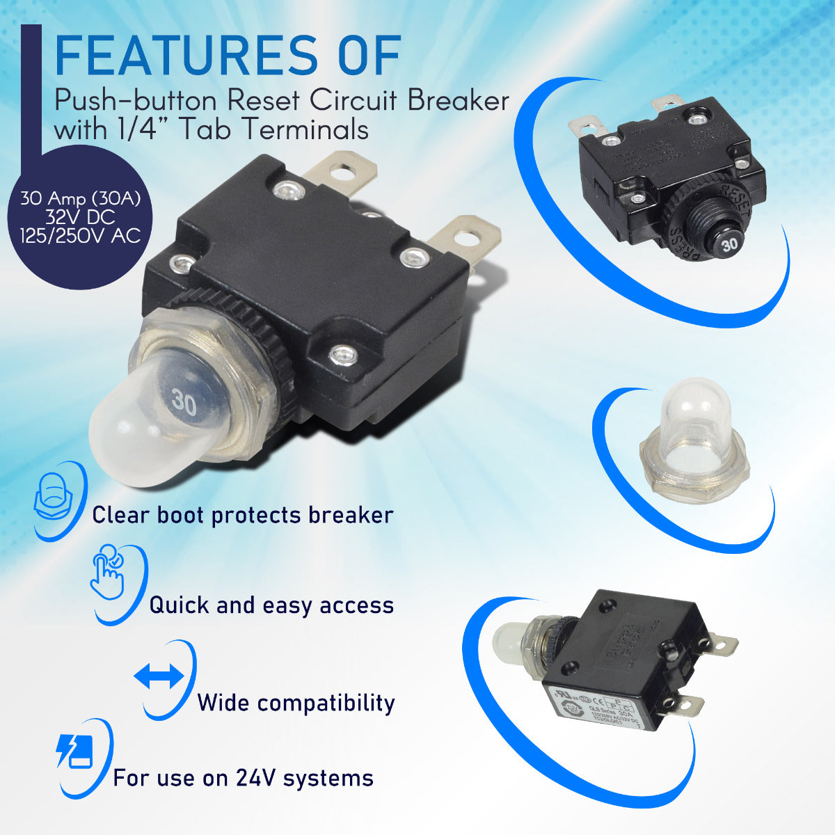 30 Amp (30A) 32VDC 125/250VAC Push-Button Reset Circuit Breaker with 1/4" Tab Terminals (61120008)