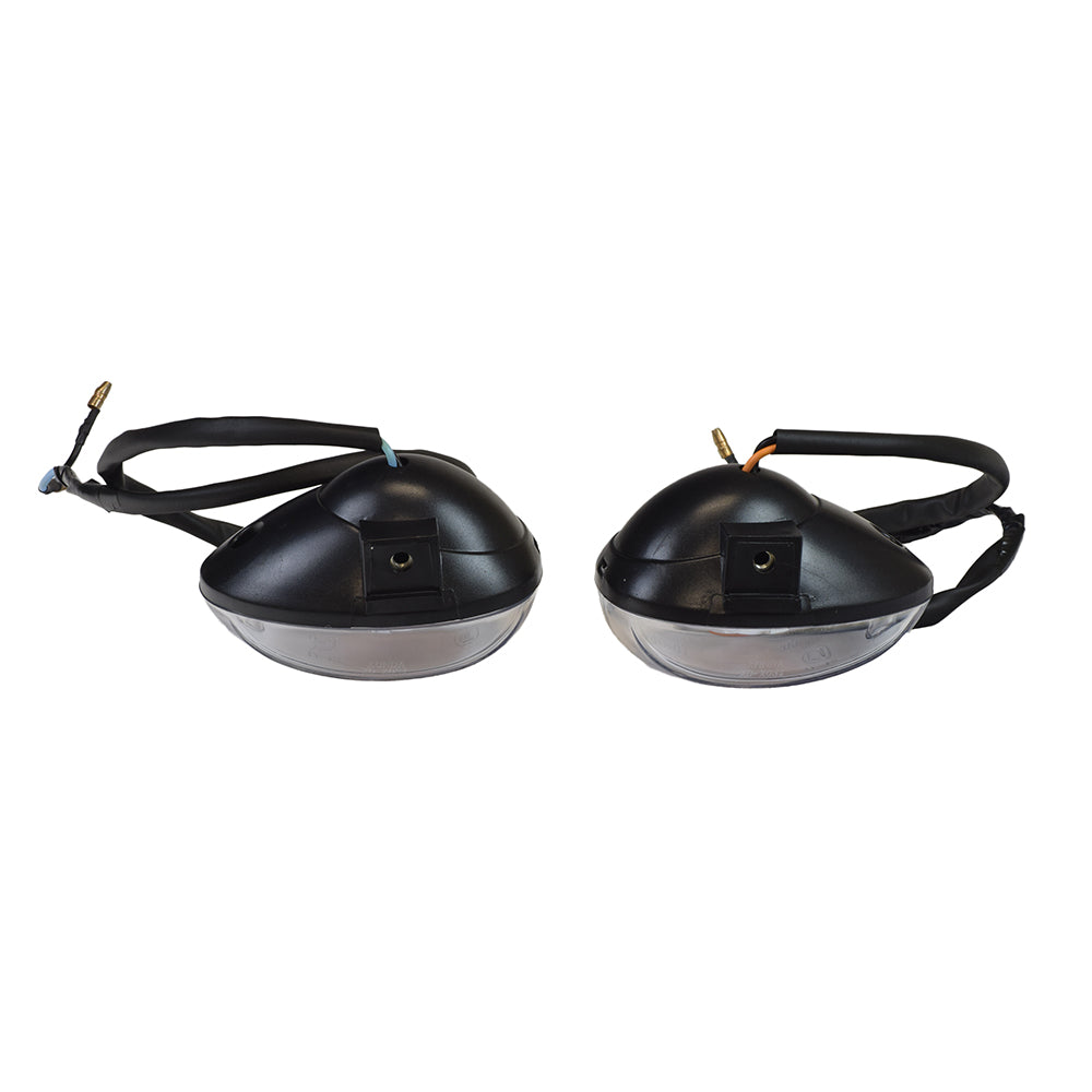Here is a set of two amber front turn signal lights with clear lenses. These signal lights are adaptable to a very wide range of street legal motor scooter.