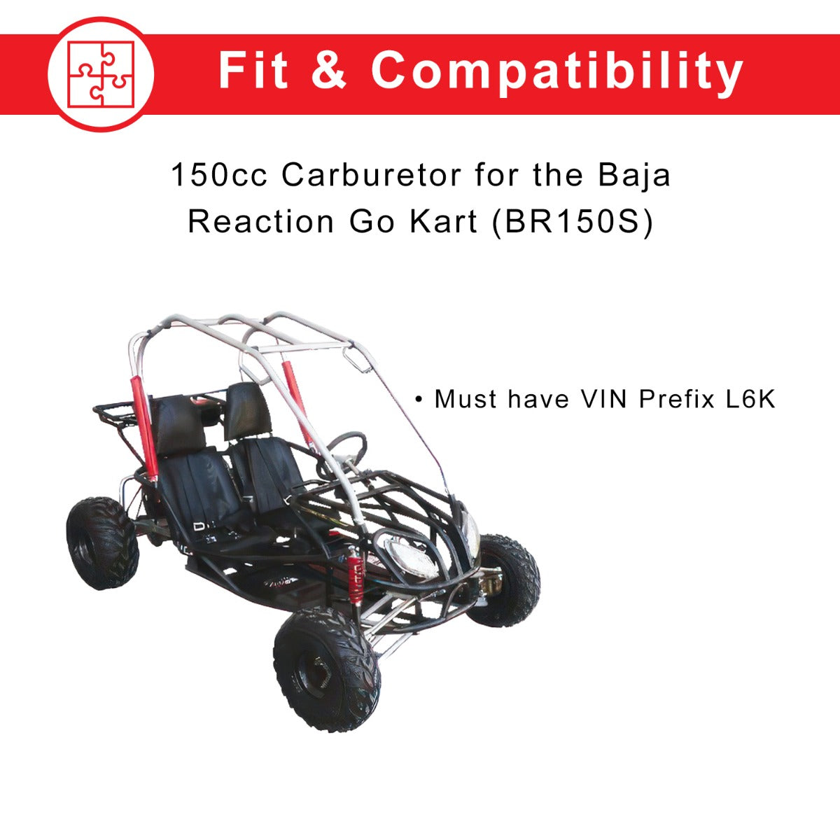 Here is a go kart part that gets around! This 150cc carburetor for the Baja Reaction (BR150S) go kart with the VIN prefix L6K is also compatible with the Dune 150cc go kart, the Baja Sun City 150cc motor scooter, and a veritable host of other gasoline engines in the 125 to 150cc range.