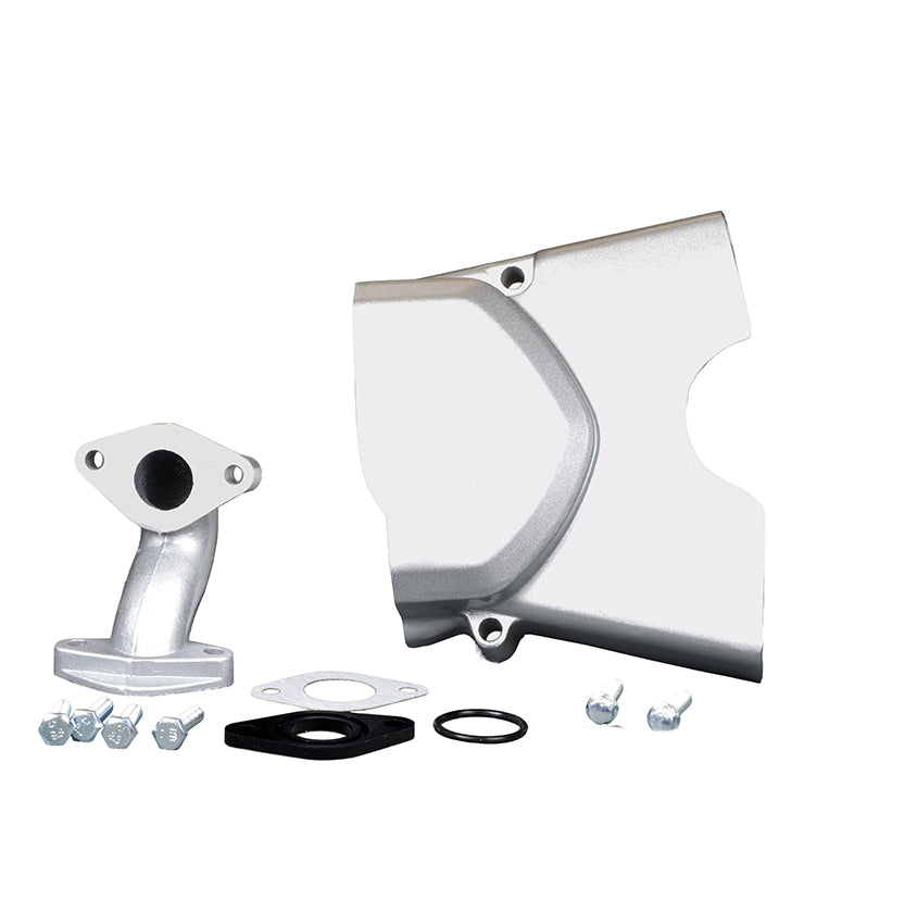 An elbow-shaped carburetor joint (or intake manifold extension) is included with this engine. Depending on your vehicle type, this cast & machined "pipe" holds the carburetor at the proper angle and away from the engine head. Although the exhaust port with the two pre-installed mounting studs uses the same hole-spacing as the intake, this intake manifold extension does not work for the exhaust due to the cut-out on the exhaust port.