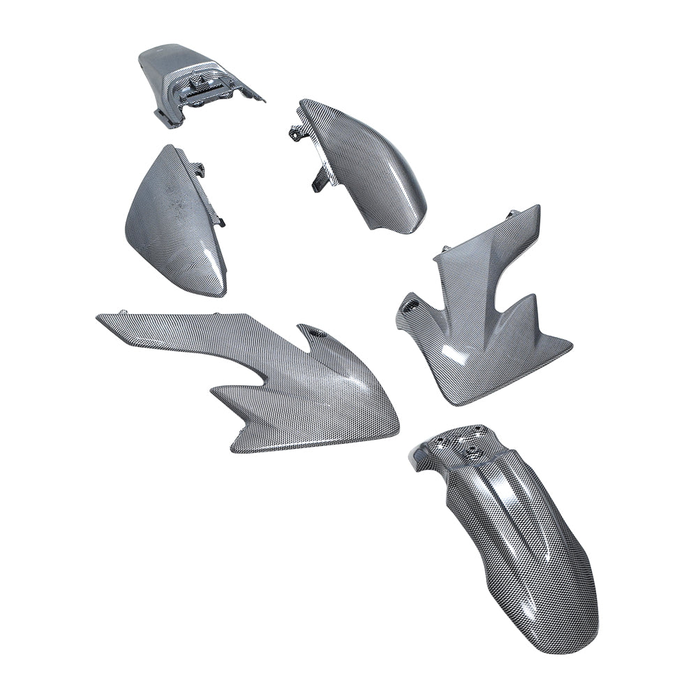 These handy and economical fender and body panel sets come in seven pieces; the front and rear fenders, two gas tank side covers, a pair of side panels, and a number plate. NOTE: The Carbon Fiber Pattern set is a 6-piece set only. It does not include the number plate panel.