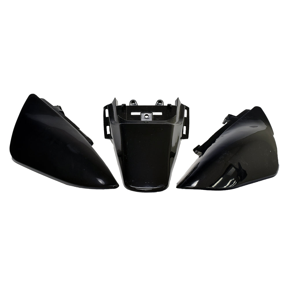 The plastic rear fender set for a wide variety of mini dirt bikes of engine sizes 49cc, 50cc, and 70cc. Includes three pieces total; two side fenders and one rear tail fender.