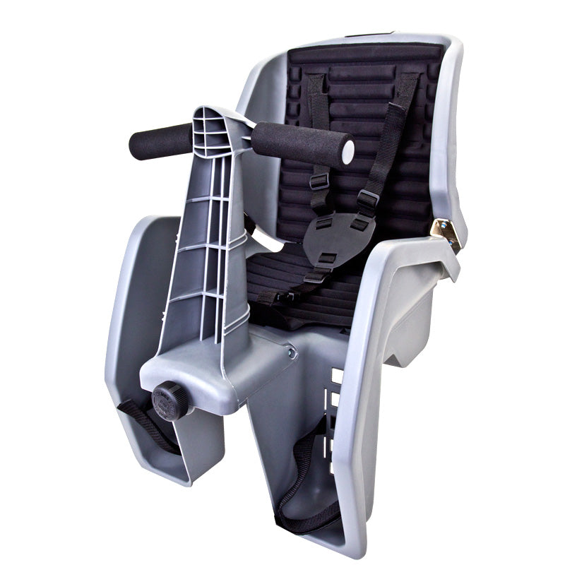 This bike child seat quickly mounts on its included steel rear rack (that doubles as a cargo rack without the seat), and cradles your child in its durable high-impact shell. The safety harness, foot straps, and grab bar all provide a snug and secure hold.