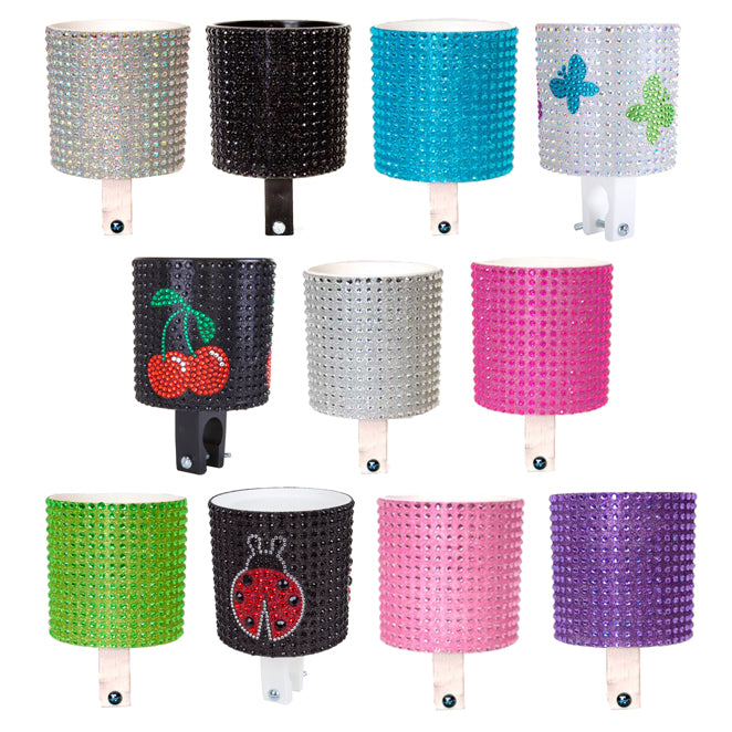 These Rhinestone Cruiser Candy cup holders are a great accessory for your bike or scooter. In addition, it's available in your choice of great color options. They come in Aurora, Black, Blue, Butterfly, Cherry, Crystal, Fuschia, Pink, Green, Pink, and Purple. .