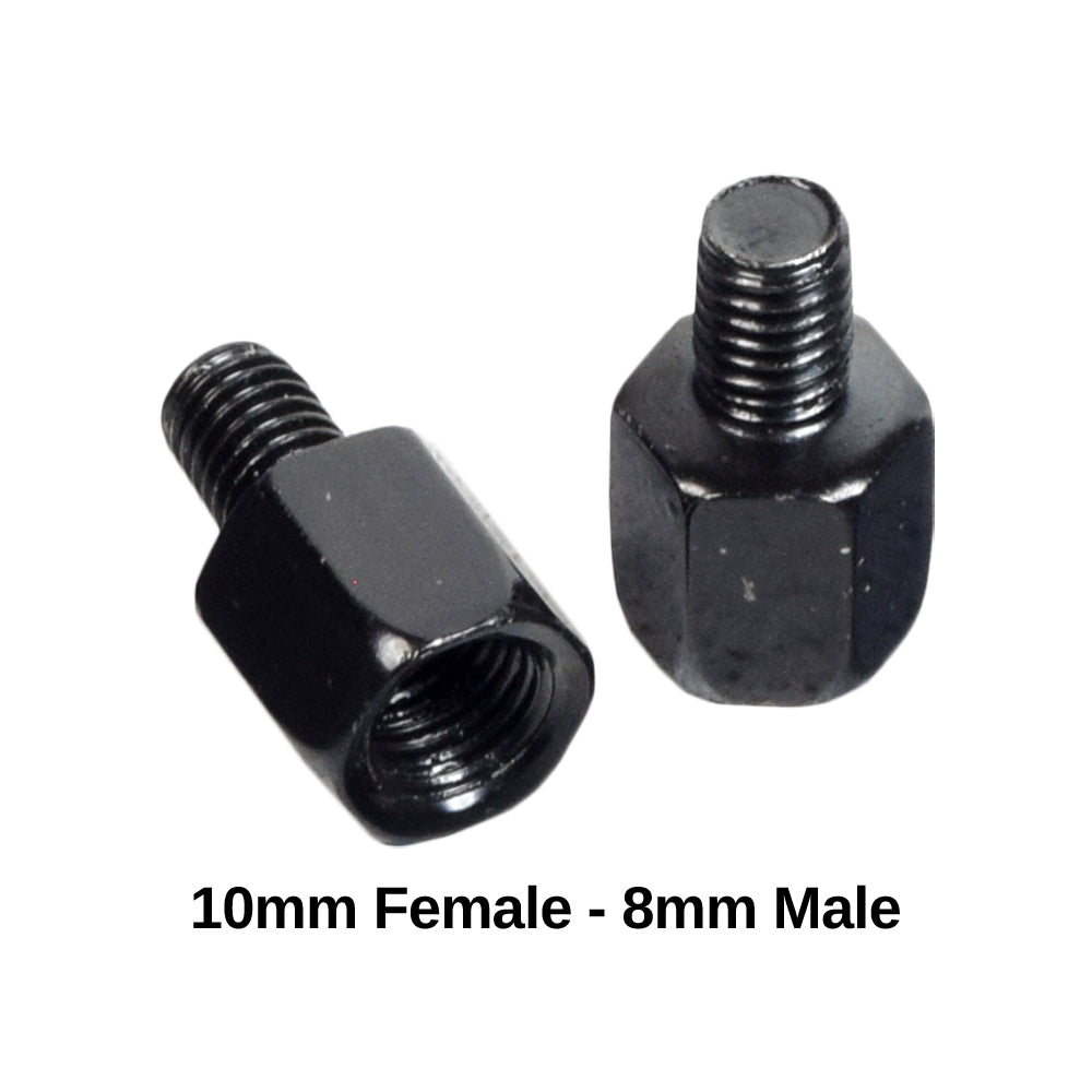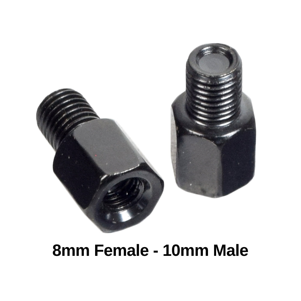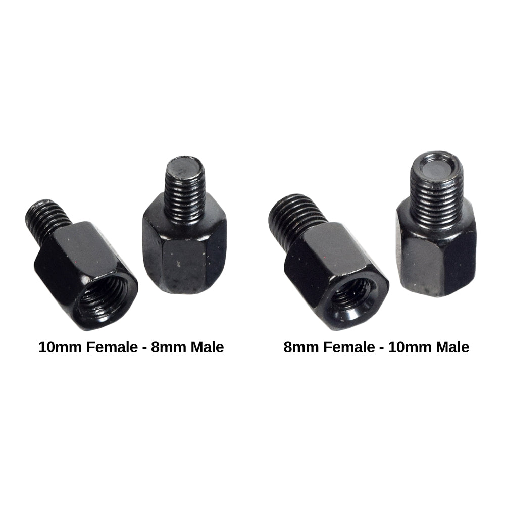 Here is a bike and scooter part that people have been clamoring for! Our mirror mount adapter for bikes and scooters allows you to mount a 10 mm male threaded mirror into an 8 mm female tapped handlebar hole, or an 8 mm male into a 10 mm female threaded aperture. Because most pre-drilled handlebars are tapped with either an 8 mm or a 10 mm thread we offer 2-packs of both versions; one for the left side of your handlebar and one for the right.