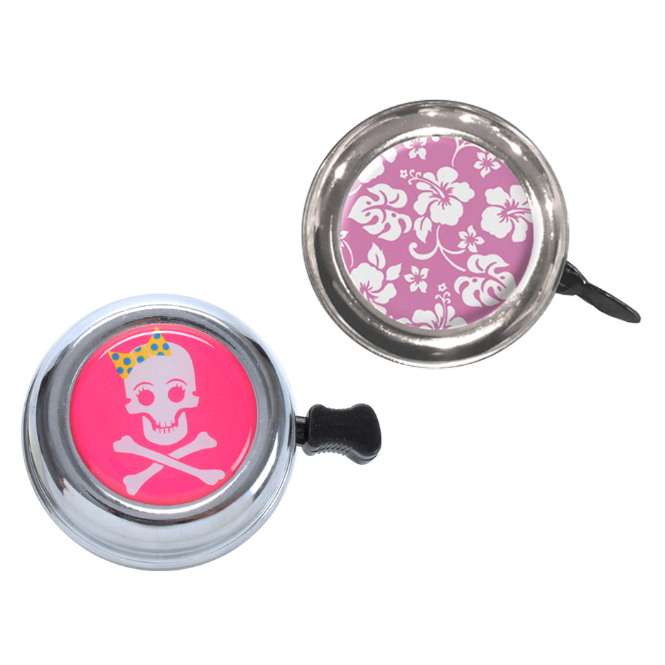 These pink handlebar bells are a great accessory for bikes & scooters, and are available in your choice of styles, Pink Girly Skull or Pink Flowers. They each sport a Chromoly steel bell on a durable steel base