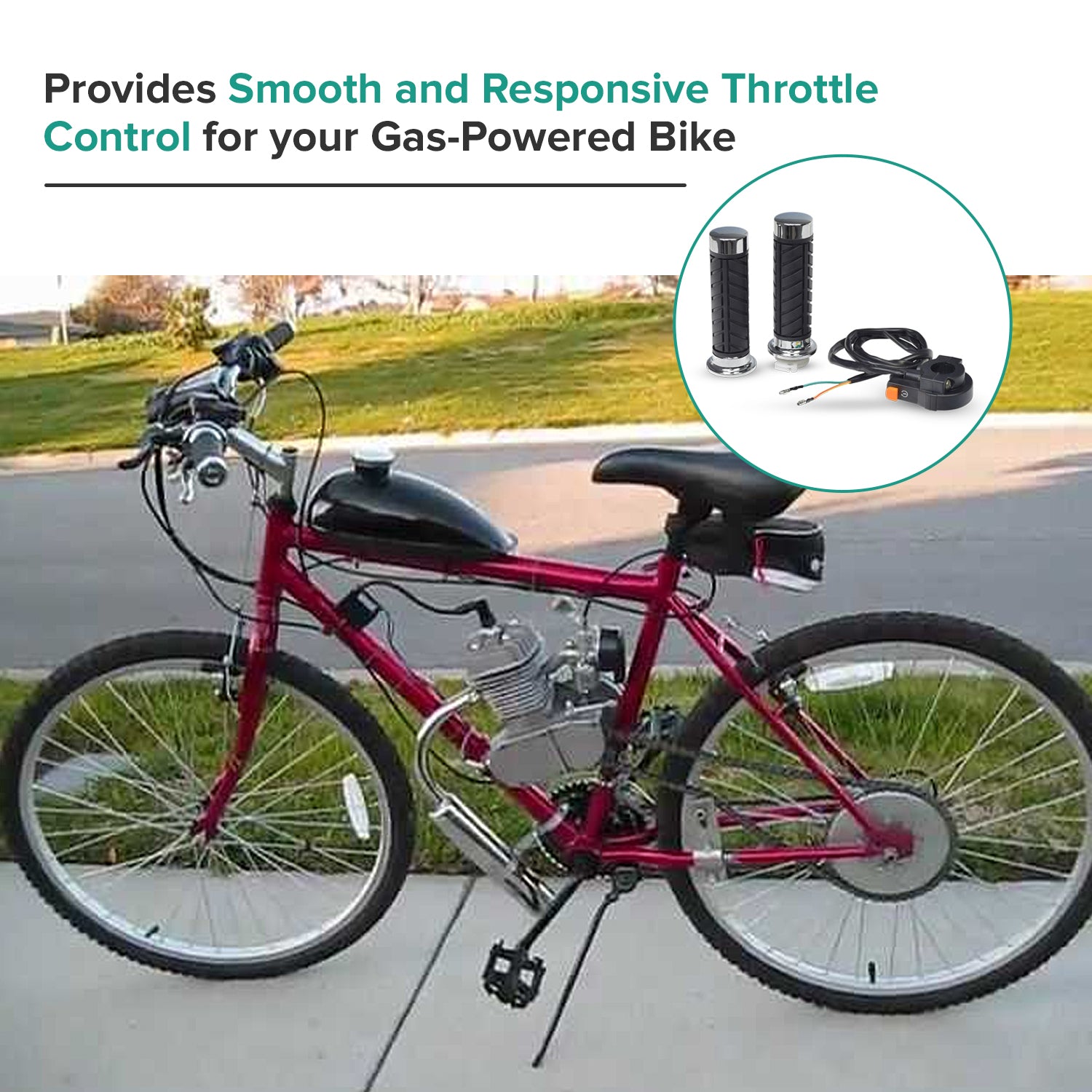 This twist grip throttle set for 48cc - 80cc 2-stroke bicycle engine kits was made to use on that gas-powered bike project you were always wanting to try. The 2-wire throttle will fit most handlebars of standard 7/8" to 1" diameter.