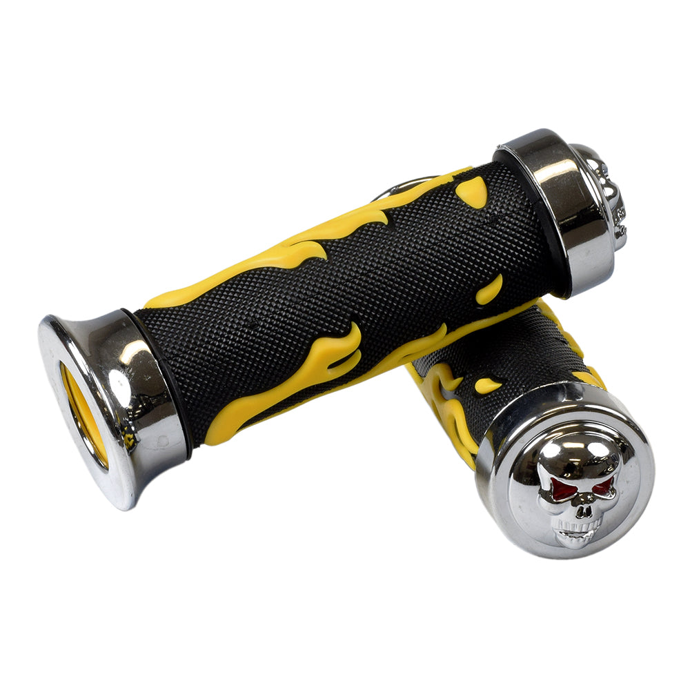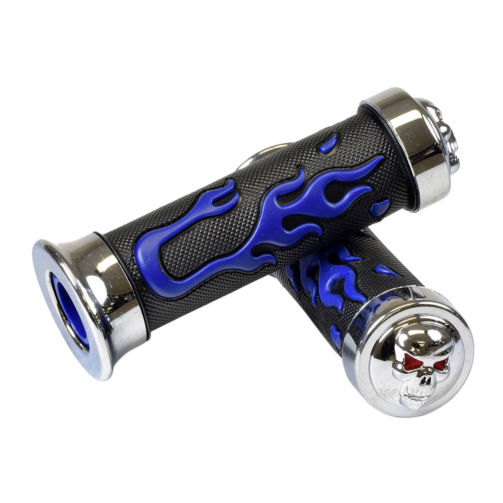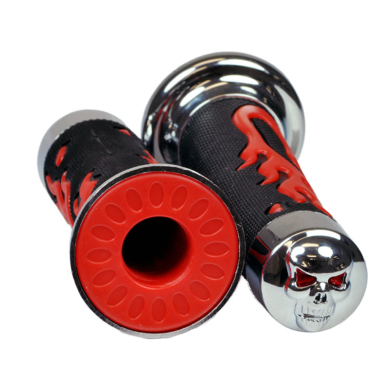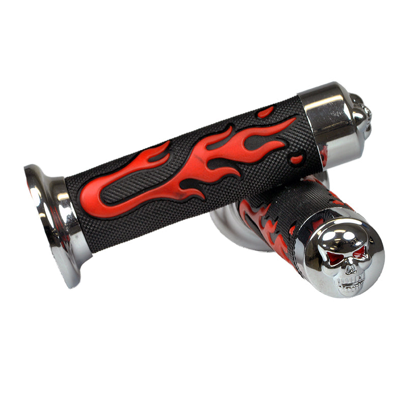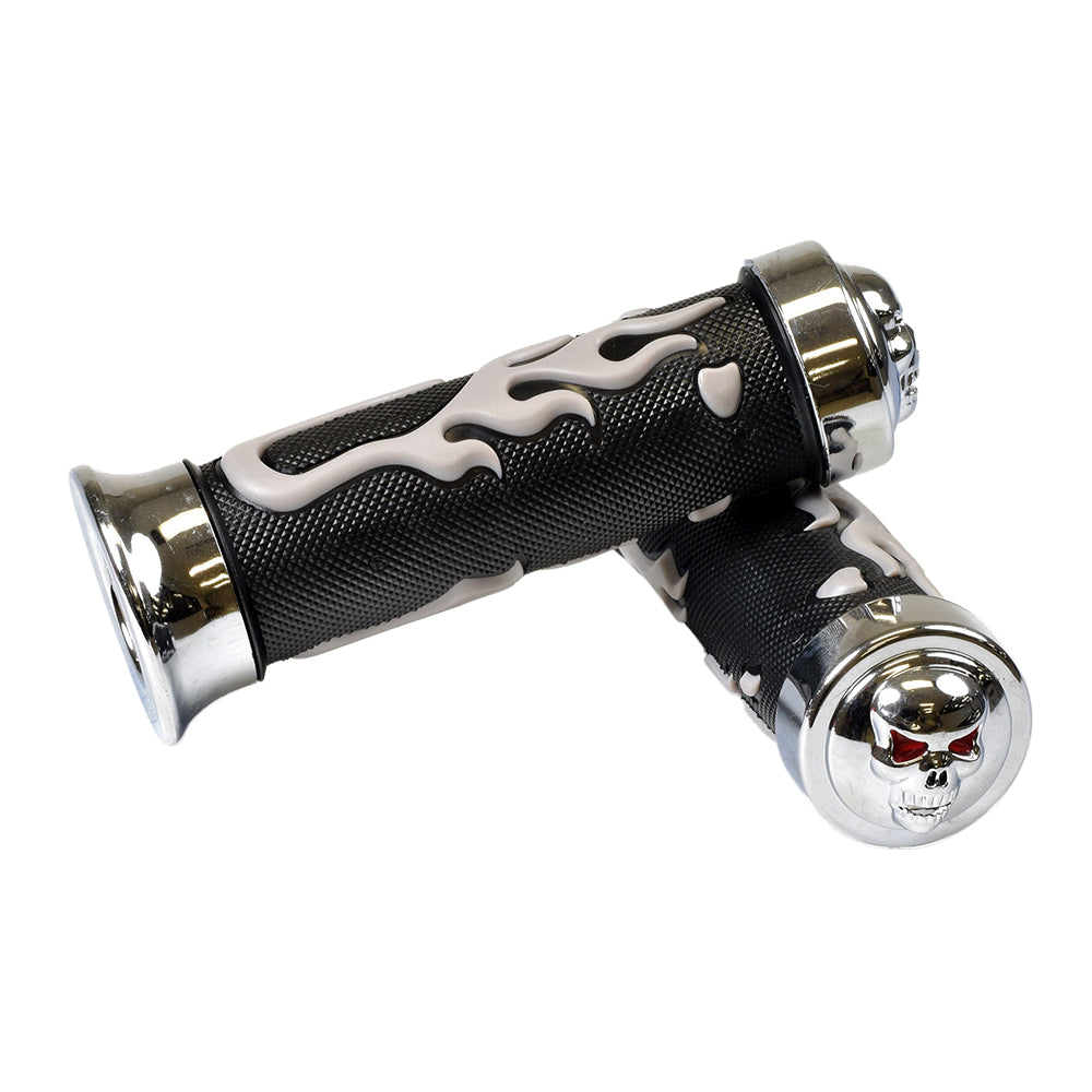 Scooter handlebar grip set for virtually all vehicles that we call scooters: mobility, recreational, gas, electric, street, ATVs, and Razor kick scooters. Compatible with all scooters or ATVs with 7/8" handlebars. Features black rubber hand grip, stylized chrome end pieces, and a sweet skull and flame design.