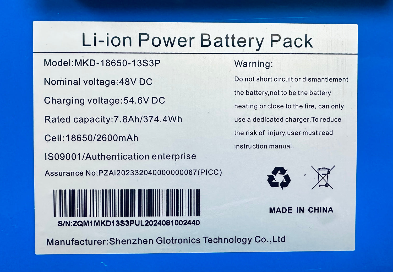 - 54.6 volt (48 volt nominal) 7.8 Ah Lithium-ion battery
