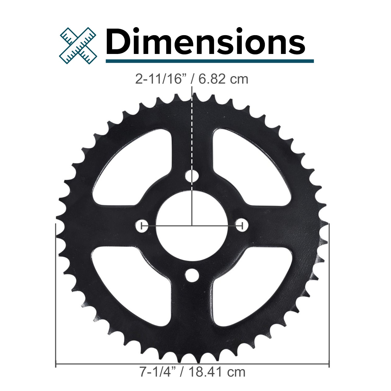 Our replacement #428 45 tooth chain rear sprocket for Coleman AT125-EX and AT125-UT ATVs uses a 7.31" disc with a 1.88" center hole, and four 0.338" unthreaded mounting holes.