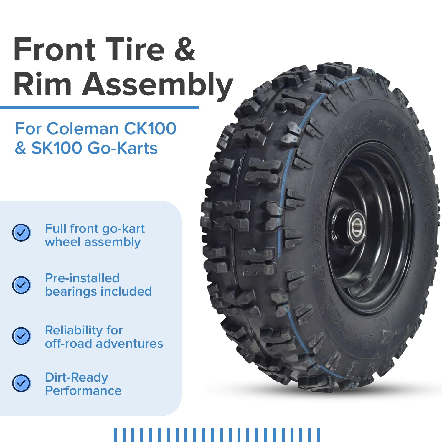 Get that go-kart back out in the dirt where it belongs with a new 13x5.00-6 front tire and rim wheel assembly for Coleman CK100 and SK100 go-karts. This is the complete assembly; a 13x5.00-6 tire, steel rim, and bearings all in a single assembly.
