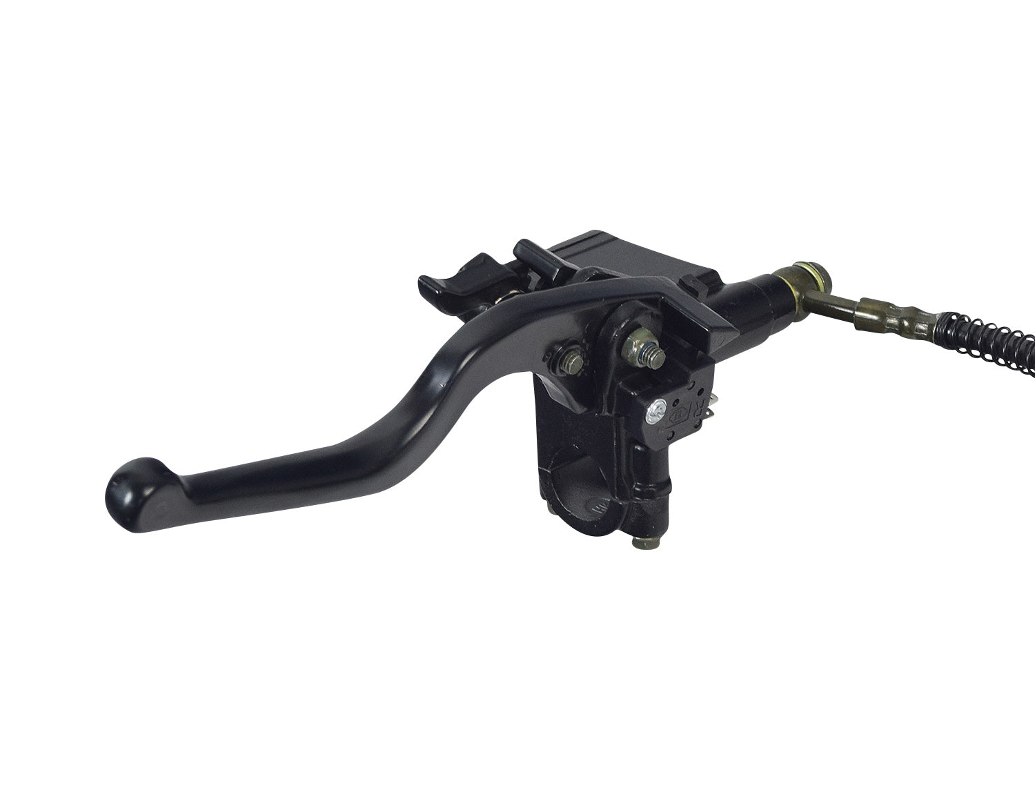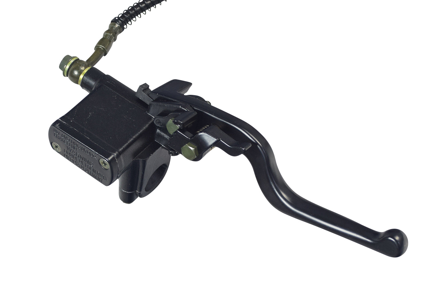 The front brake assembly for Coleman AT125-EX and AT125-UT ATVs comes as a complete unit. The assembly includes the two calipers with asymmetrical brake pads, the master cylinder, brake fluid line with "Y" splitter, and a handlebar-mounted lever. This mounts on the right side of the ATV's handlebar.