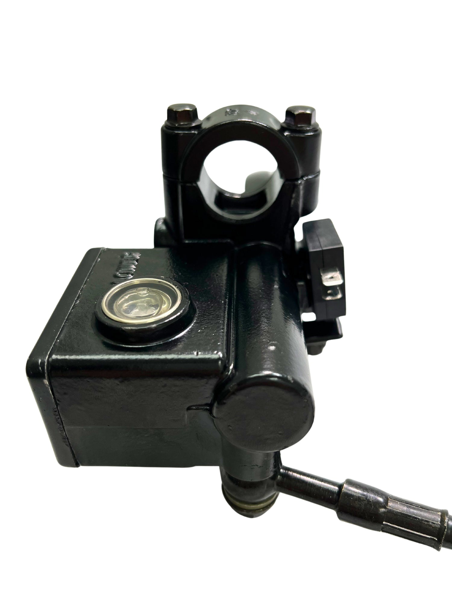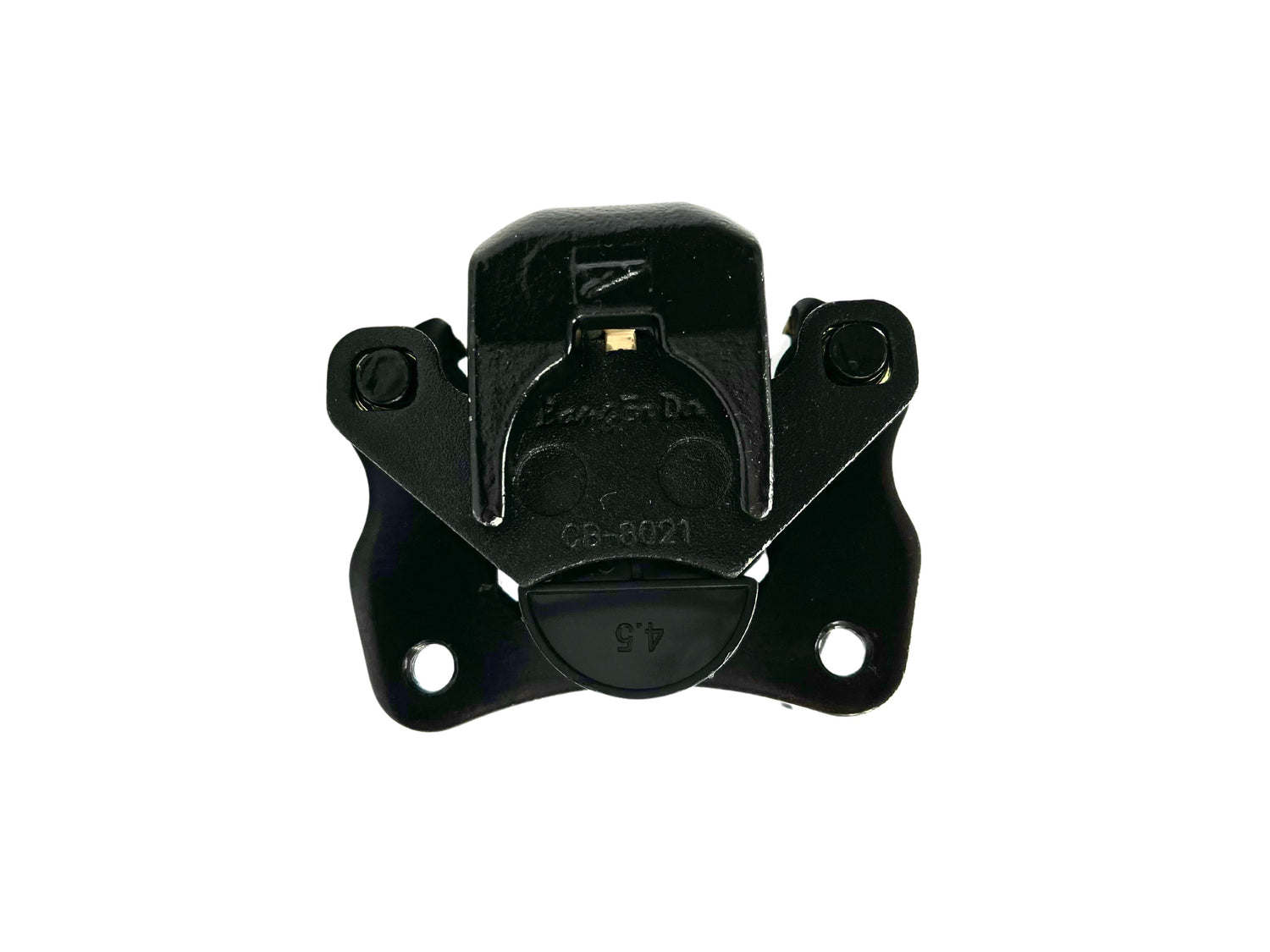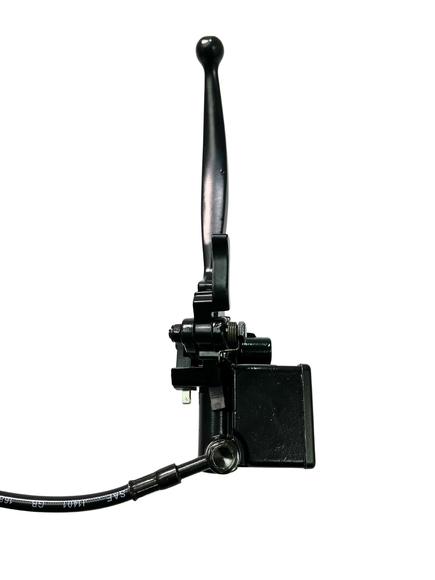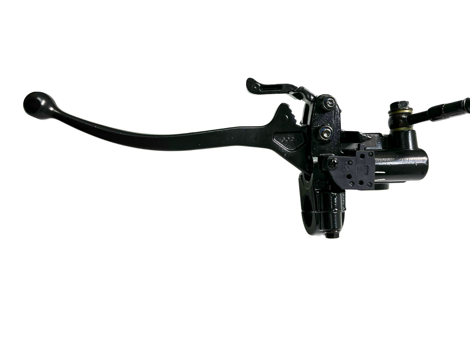 The front brake assembly for Coleman AT200-B ATV comes as a complete unit. The assembly includes the two calipers with asymmetrical brake pads, the master cylinder, the brake fluid line with "Y" splitter, and a 7-1/2" handlebar-mounted lever. This mounts on the right side of the ATV's handlebar.