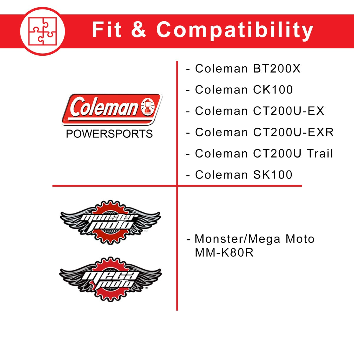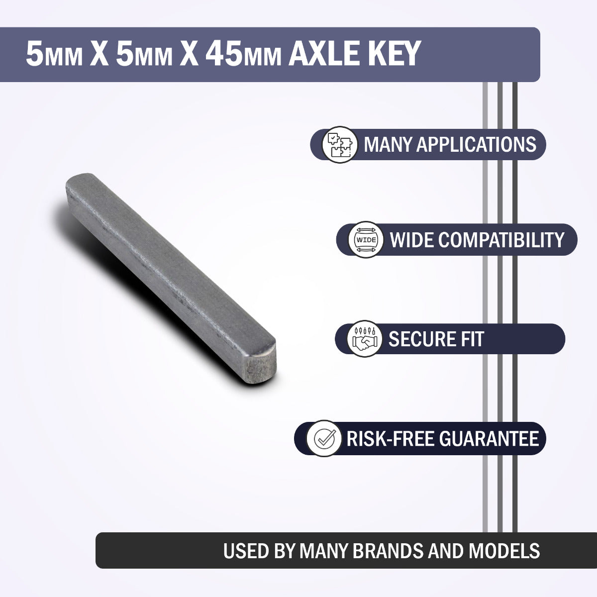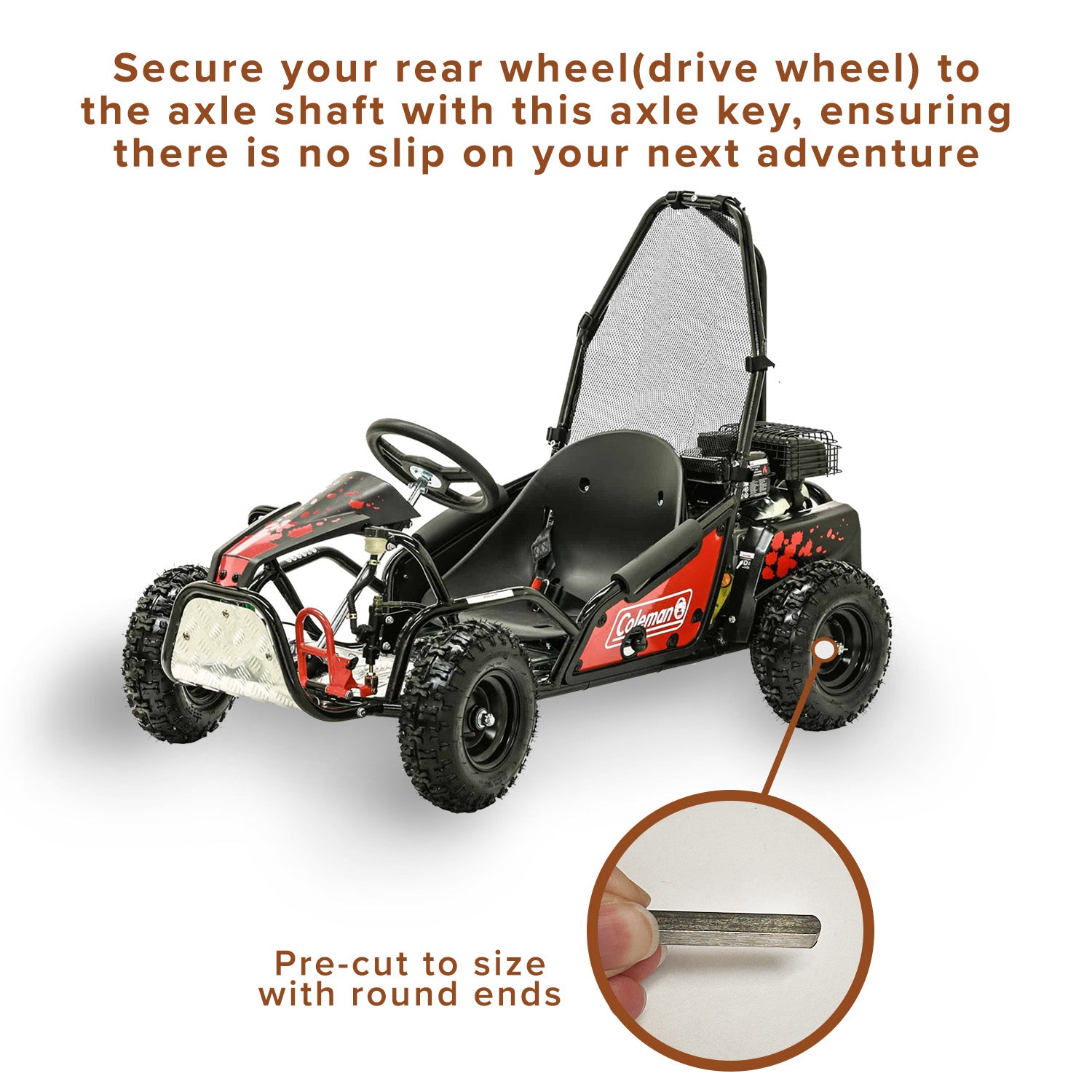 The 5 mm x 5 mm x 45 mm axle key has a vast myriad of applications holding drive wheels on numerous brands and models including Coleman, Mega Moto and others. Mega Moto uses this size axle key to secure the rear wheels (drive wheels) to the axle shaft on their MM-K80 80cc go-kart.