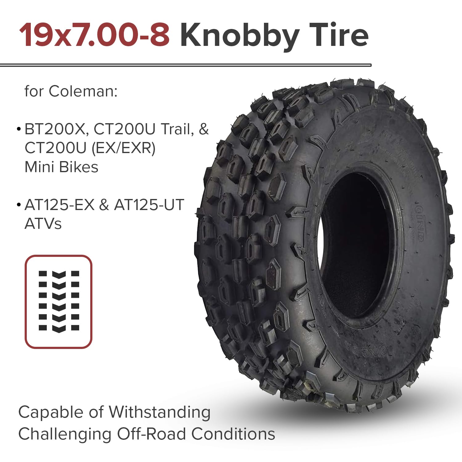 The 19x7.00-8 Knobby Tire for the Coleman BT200X, CT200U Trail, & CT200U-EX/EXR Mini Bike and AT125-EX & AT125-UT ATV is an excellent ring of rubber to keep your Coleman slinging the dirt and the mud behind you. Aggressively treaded, this is an adaptable tire that keeps you moving when the ground gets soft, hard, wet, or dry.