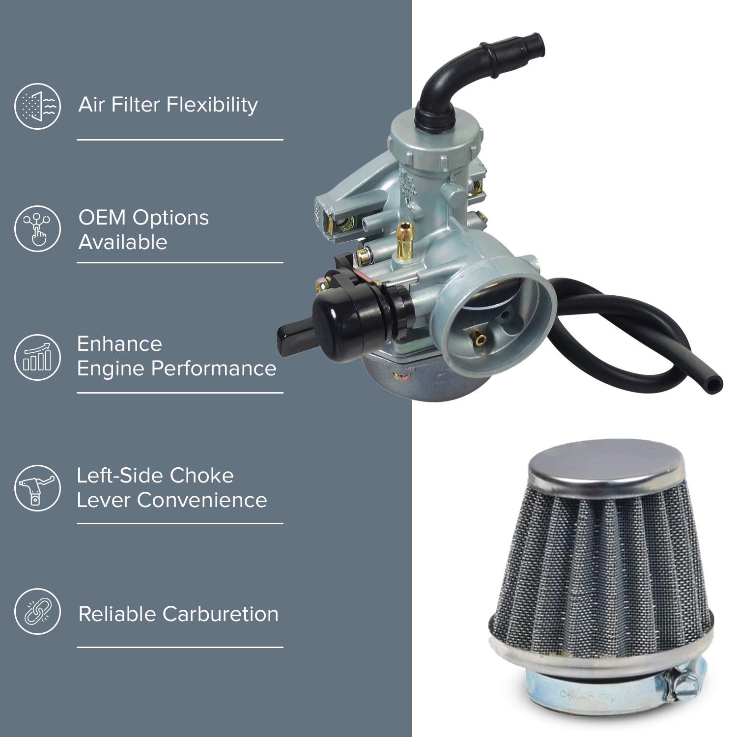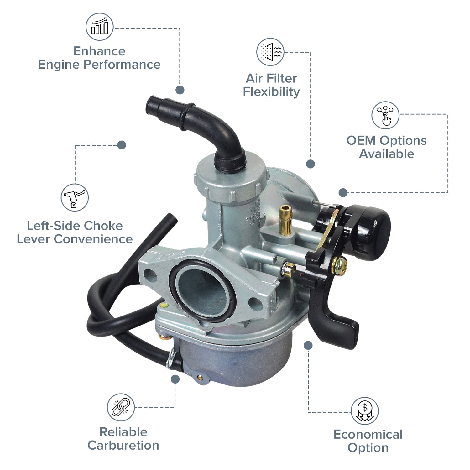 A carburetor is like a powersports engine's lungs, and quality parts like these ensure a better ride. Because a carburetor works best when the air that flows into it is clean, we offer these PZ22 carbs with or without a matching filter to keep the dust and crud out. Whether you only need the carb or if you prefer the carb & filter combo, we are sure that these easily-installed PZ22 carburetors will enhance your engine's performance. These carburetors use left-side choke levers.