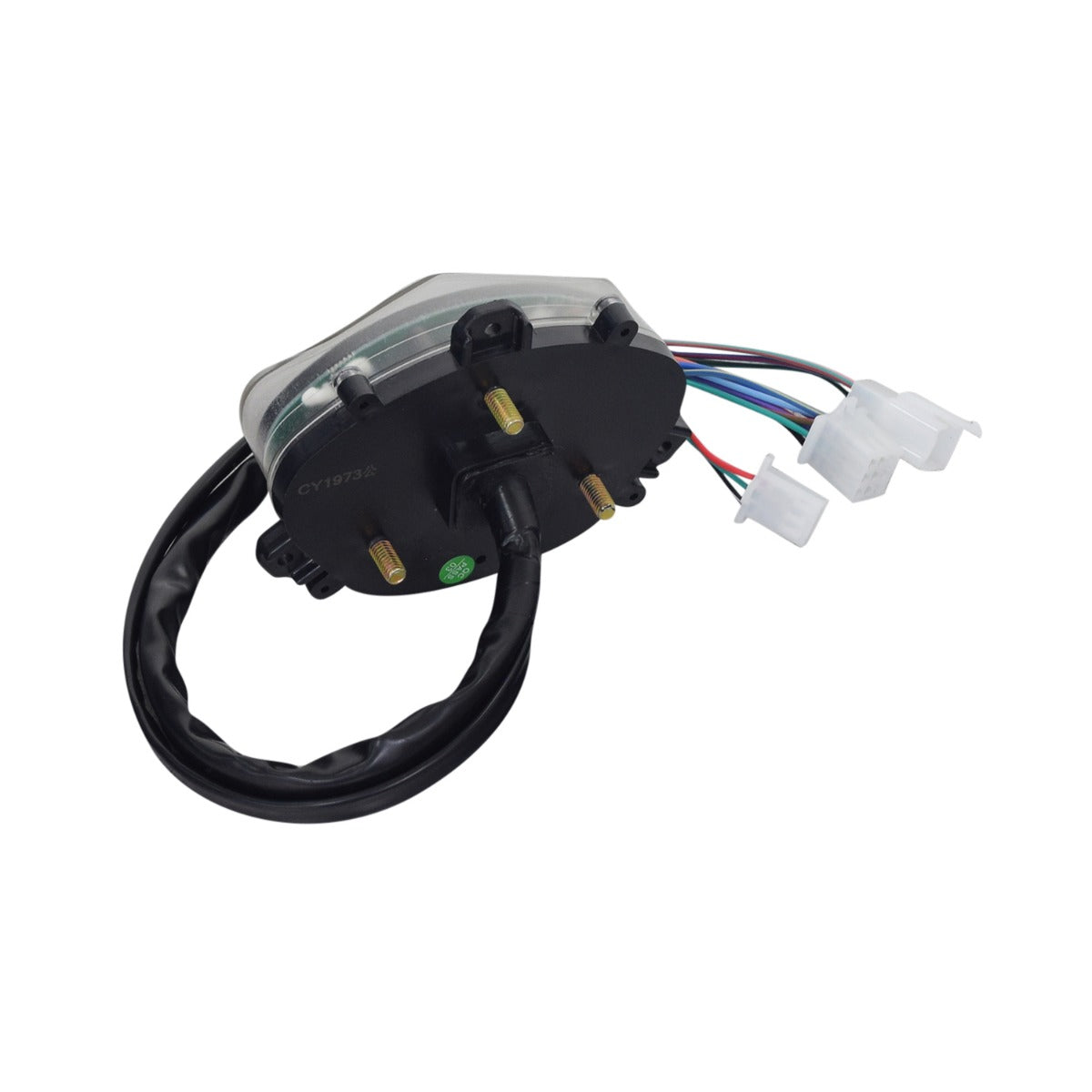- Displays speed, engine RPMs, headlights, gear indicator, & odometer