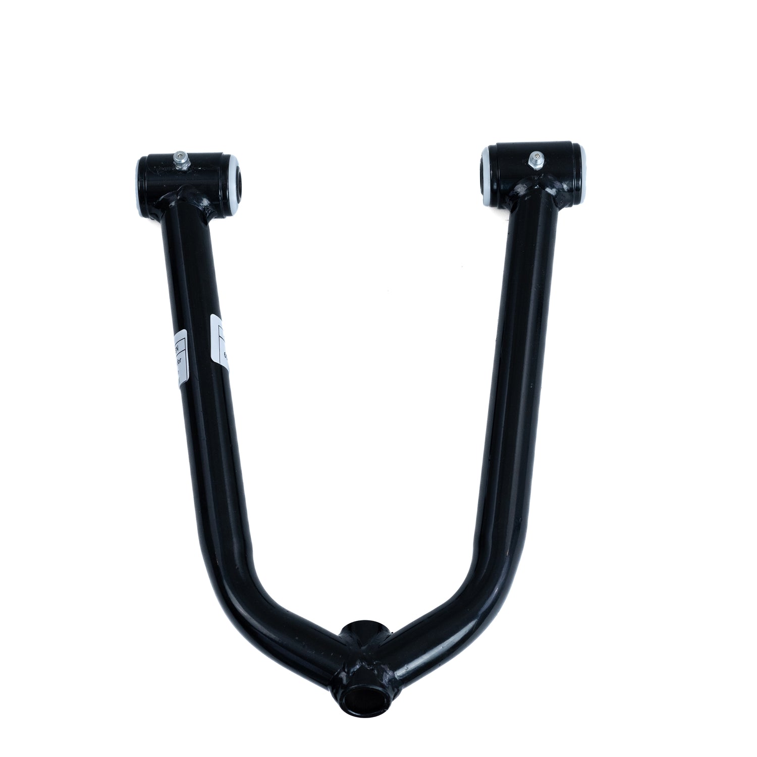 The a-arm is made of black enameled steel and comes with pre-installed bushings, spacers, and grease fittings (aka "zerks").