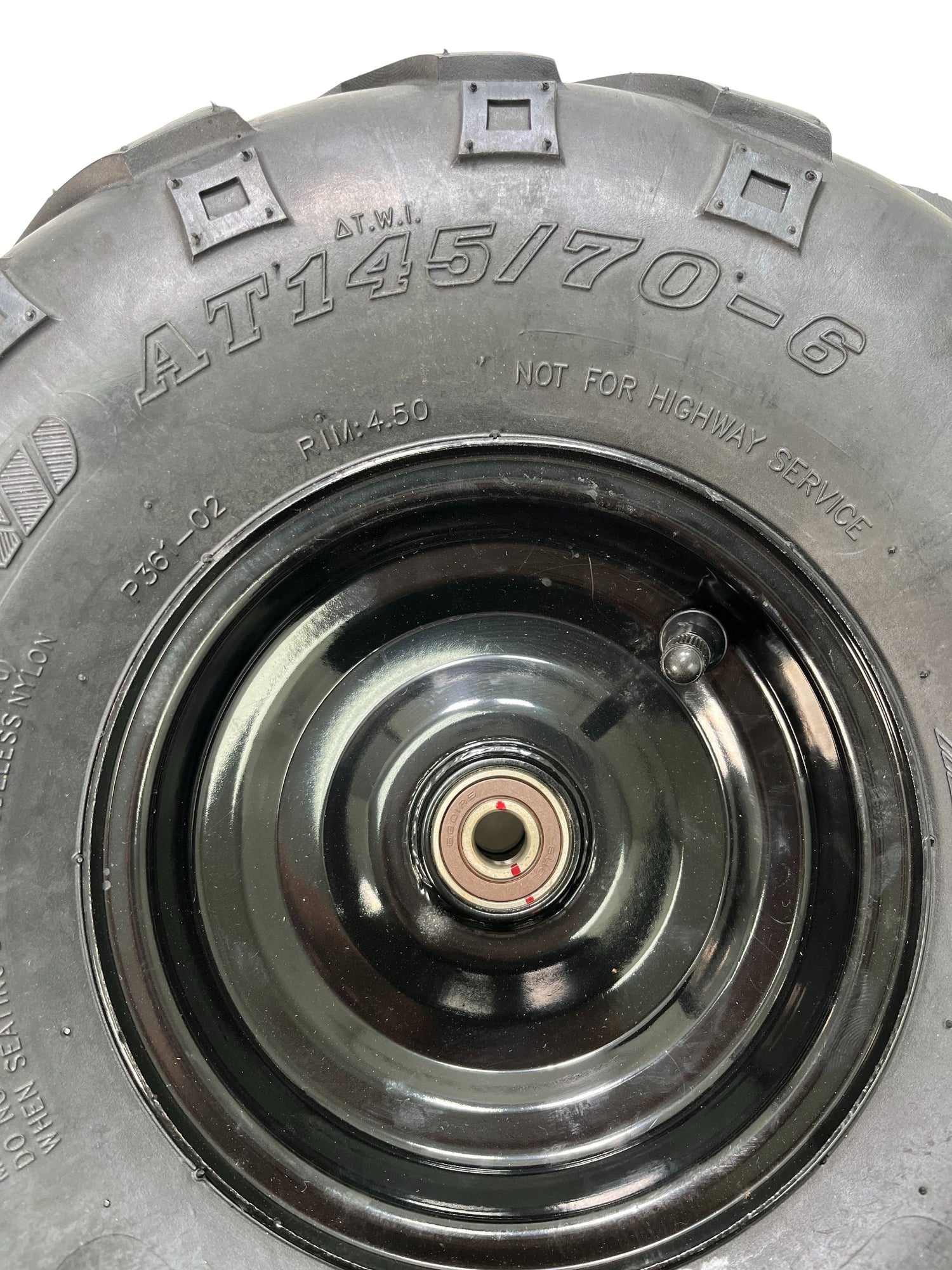 The front wheel assembly with rim and directional tire for the Coleman KT196 and CK196 196cc 6.5 Hp go-kart is a single all-in-one unit. The 145/70-6 steel rim with a sturdy V-tread directional tire for better traction on the track or trail.