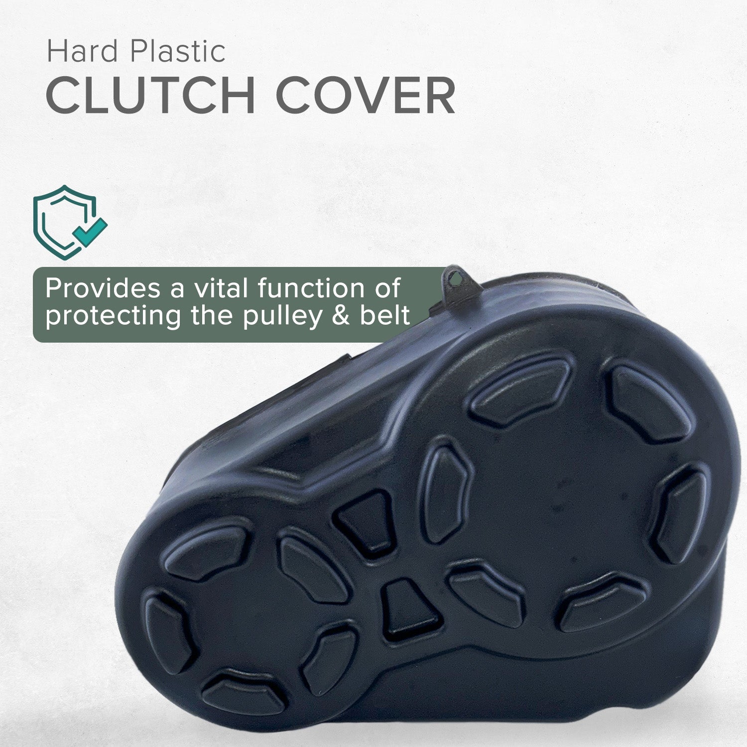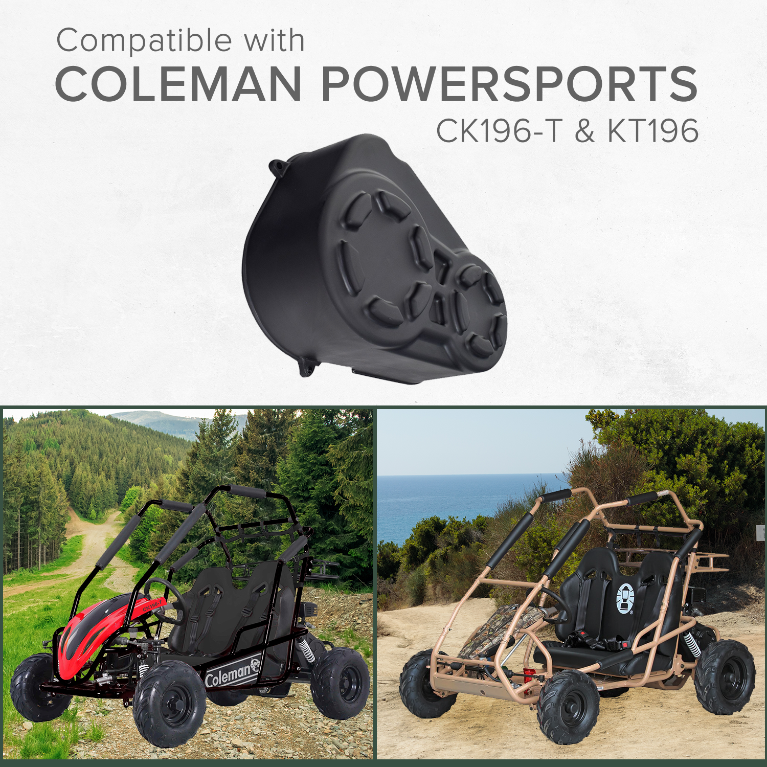 The plastic clutch cover for the Coleman KT196 196cc 6.5 H go-kart is an affordable aftermarket go-kart part. Made of black plastic, it provides a vital function of protecting your go-kart torque converter pulleys and belt.