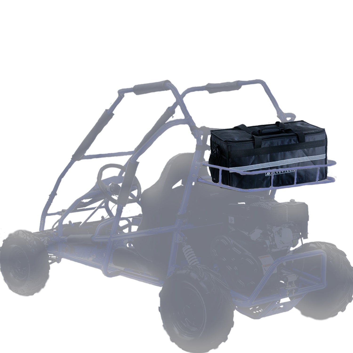 Our AlveyTech brand rear cargo rack insulated bag for the Coleman KT196 and CK196-T go-karts. The 23-1/2" wide x 11" deep x 11" high gives this an incredible 2843 cubic inches of carrying capacity.