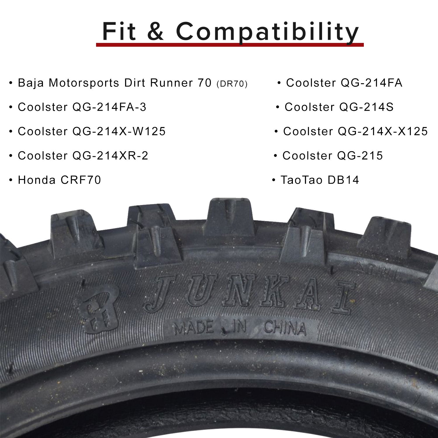 This is an affordable 4-ply rated 3.00-12 dirt bike tire, compatible with models from Baja Motorsports, Coolster, Honda, and Tao Tao. Typically these dirt bikes are clones of the Honda CRF70 dirt bike, such as the 70cc Baja Motorsports Dirt Runner DR70.