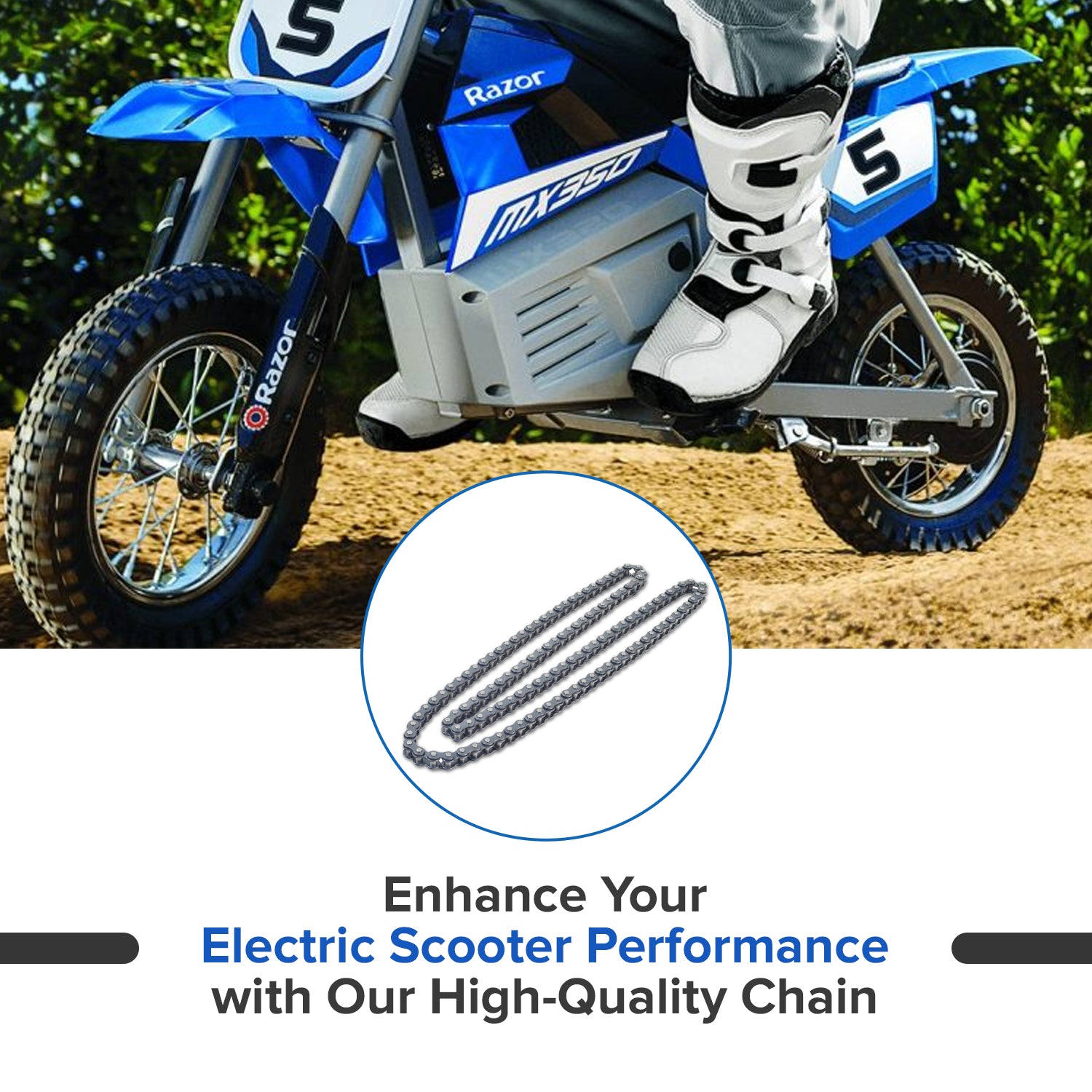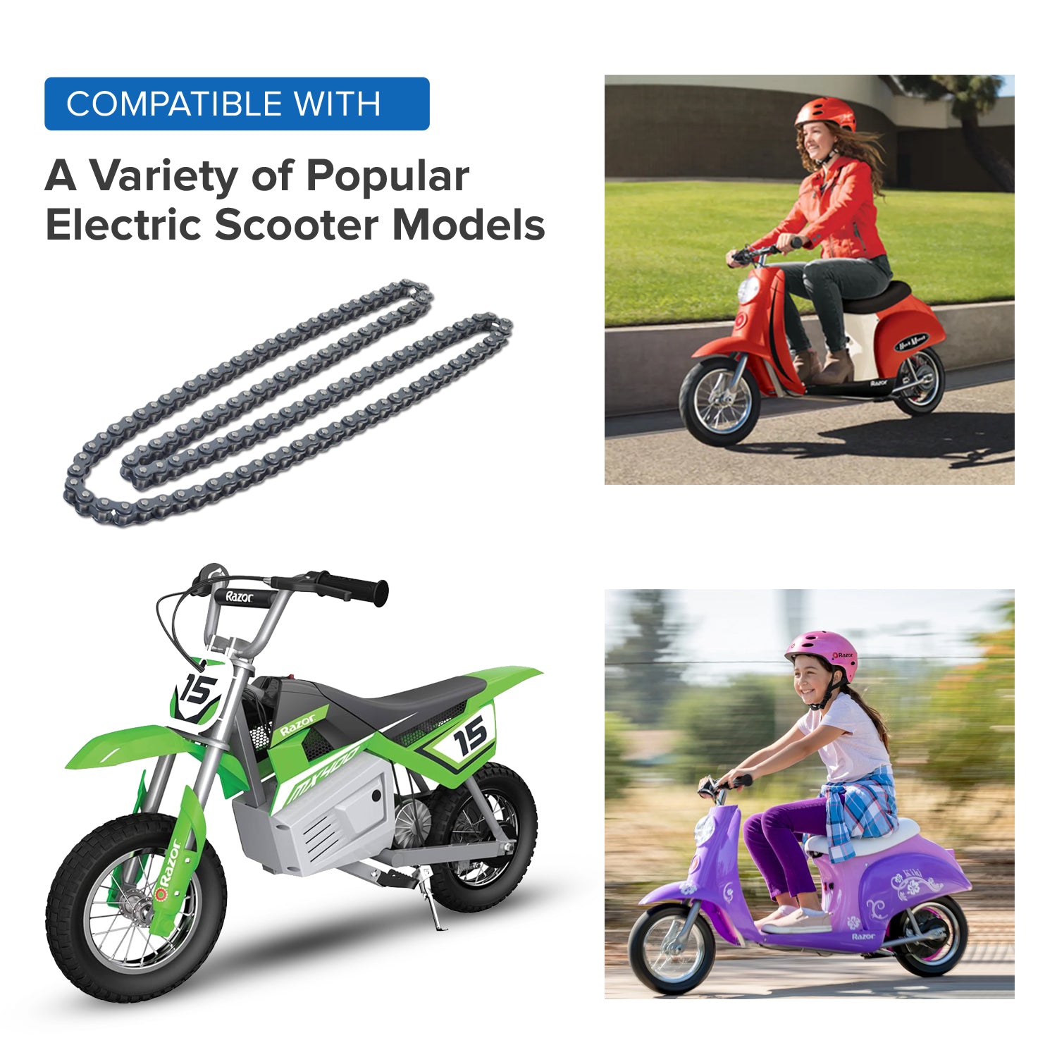 This chain is compatible with the Razor Pocket Mod, Sport Mod, MX350, MX400, and also the Motovox MBxXSe Mini Bike. May also fit other brands of scooters and electric recreational vehicles.