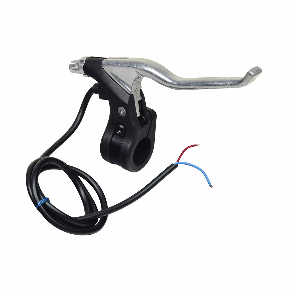 Brake lever for recreational scooters, with polished aluminum handle, wires, and built-in return spring. Mechanical brake cable not included.