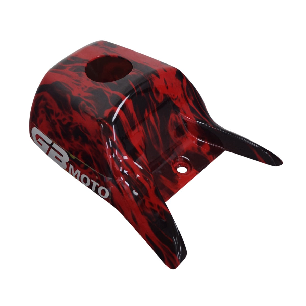 Our fuel tank cover for the Fit Right DB003 40cc 4-stroke mini bike is a hard plastic shroud which mounts atop and protects the DB003's steel fuel tank. There are two 3/8" mounting holes (front and rear). Of note is the distinctive black & red flame finish.