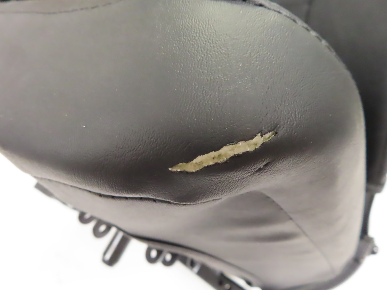 This seat is brand-new but has a 1" tear on the front of the seat base upholstery. That is just enough blemish to prevent us from selling this great mobility seat as perfect, but ypu may be able to reuse your old seat base cover. This Go-Go and Pride seat assembly includes the molded plastic seat back, the seat base, both black vinyl seat back and base covers, along with their foam inserts, and seat frame. In addition, we even include the left and right armrests, and armrest knobs.