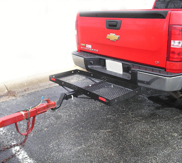 Can you ever have enough cargo hauling capacity? Hitch-mounted carriers certainly fill the niche, but sometimes you need even more. Our 48" x 20" steel cargo carrier with tow option will allow you to move as much as 500 lbs. worth of cargo on the carrier's mesh bed, but it gets even better. With its built-in rear Class III (2") receiver hitch, you can tow an additional 3000 lbs. behind you.