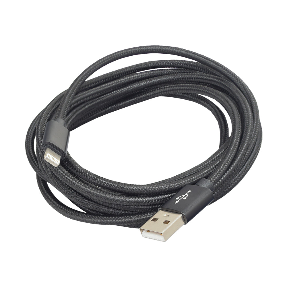 Our 3-meter braided USB lightning cable keeps you connected even as far as nine feet away! This USB to 8-pin cable is an inexpensive way to replace a worn or malfunctioning Apple USB cable with one of superior quality and performance. The braided cable is superior to non-braided rubber types as it is far more tangle-resistant and durable. In addition, those three meters of length (almost 10 feet) is long enough to thread through an extended workspace, garage bench, or vehicle.