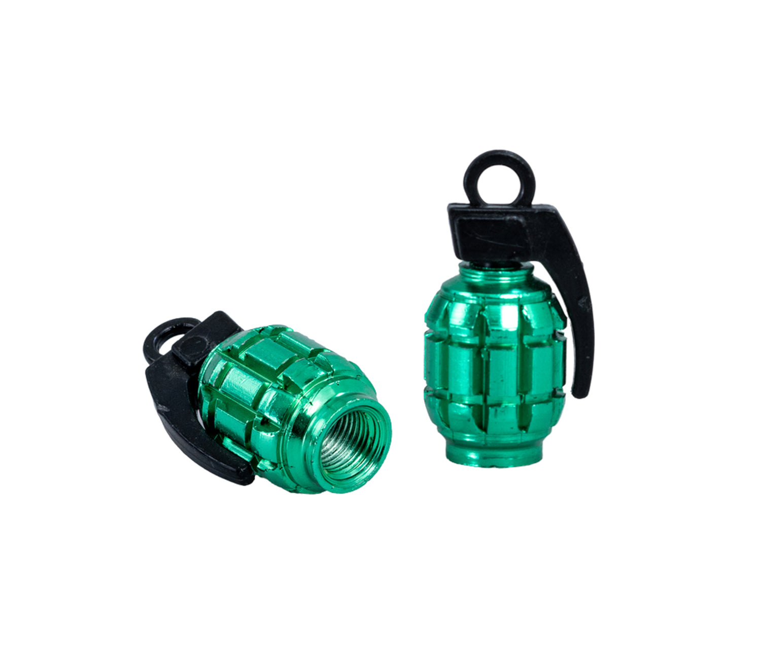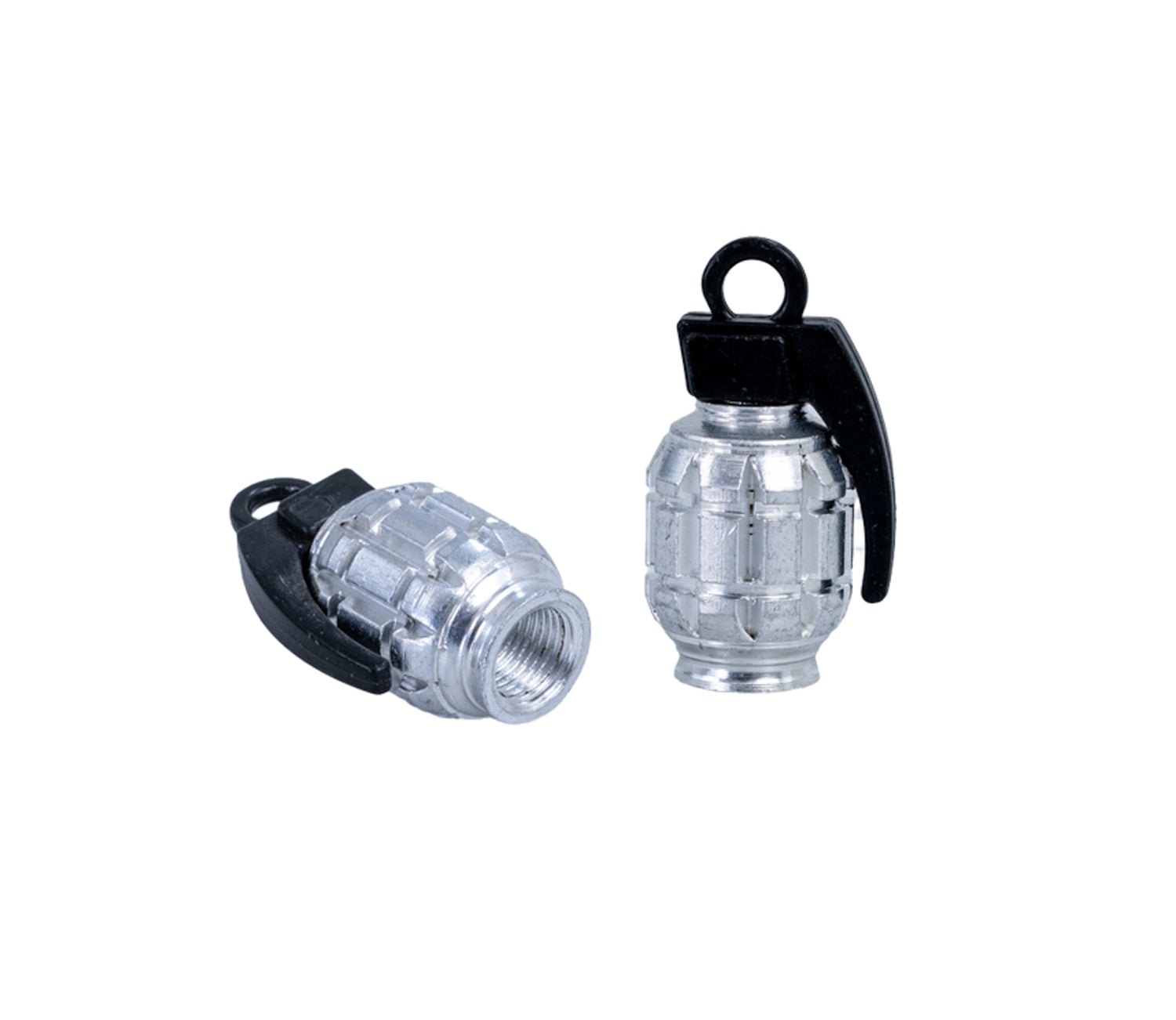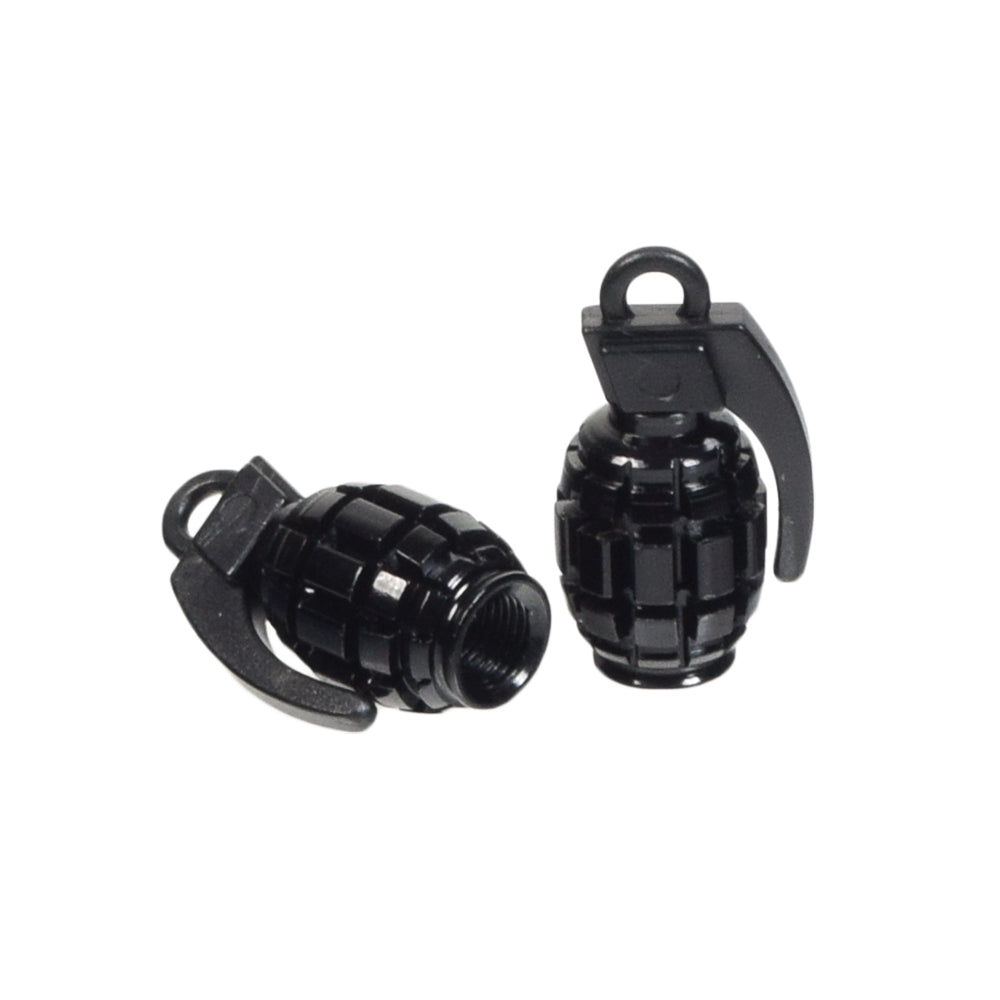 Now you can turn your bike or scooter into "Da Bomb" with a set of grenade valve stem caps. We offer several color options for these unique caps to fit over the Schrader valves in your inner tubes. A set of these novelty valve stem caps is a great way to add a dash of personal flair to your bike or scooter.