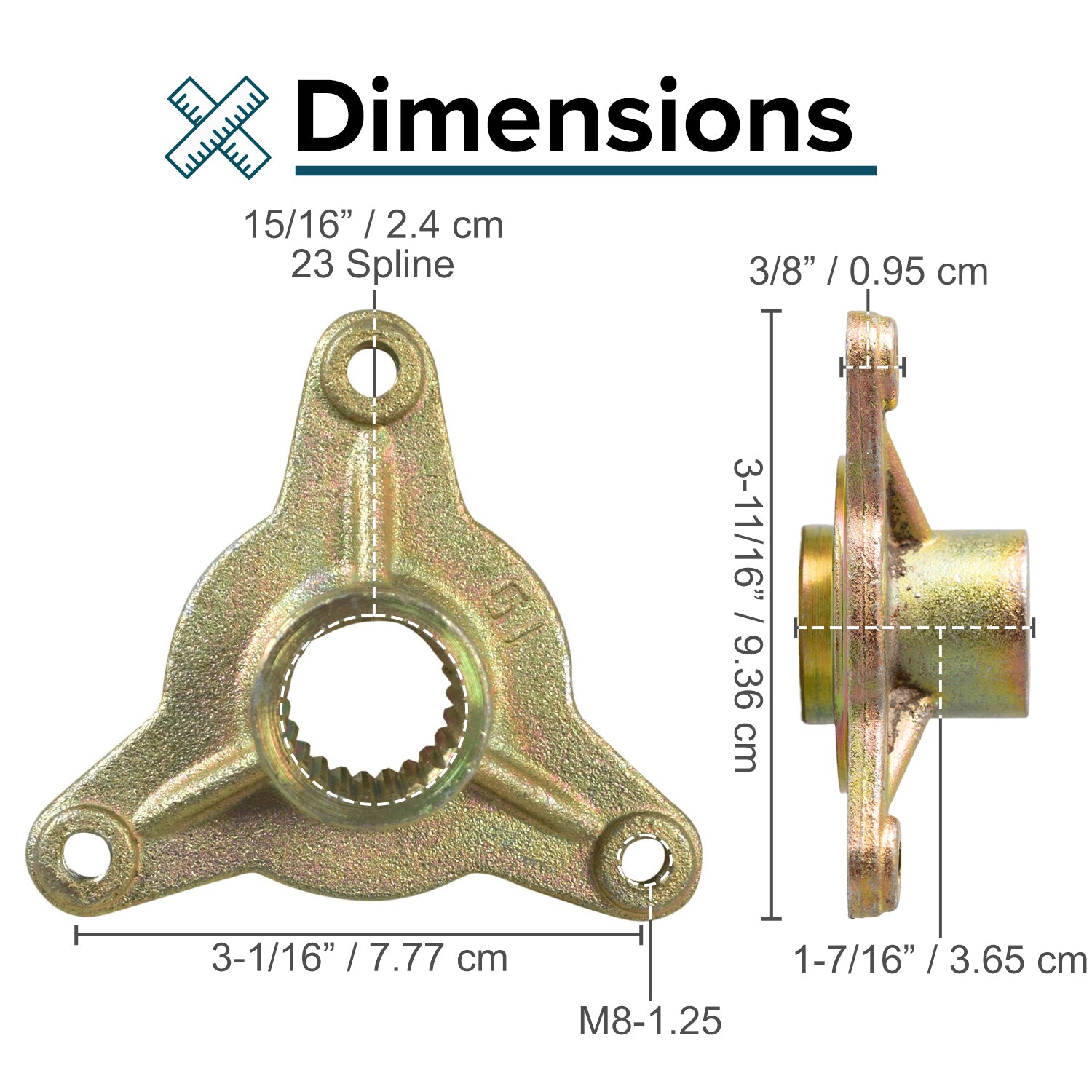 The rear wheel hub for 110cc-125cc ATVs and go-karts is compatible with a number of 4-wheel powersports machines with 7" rims. This hub has three mounting holes spaced 78 mm (3.06") apart, center to center. It also uses a 24 mm (0.93") center hole with 23 splines.