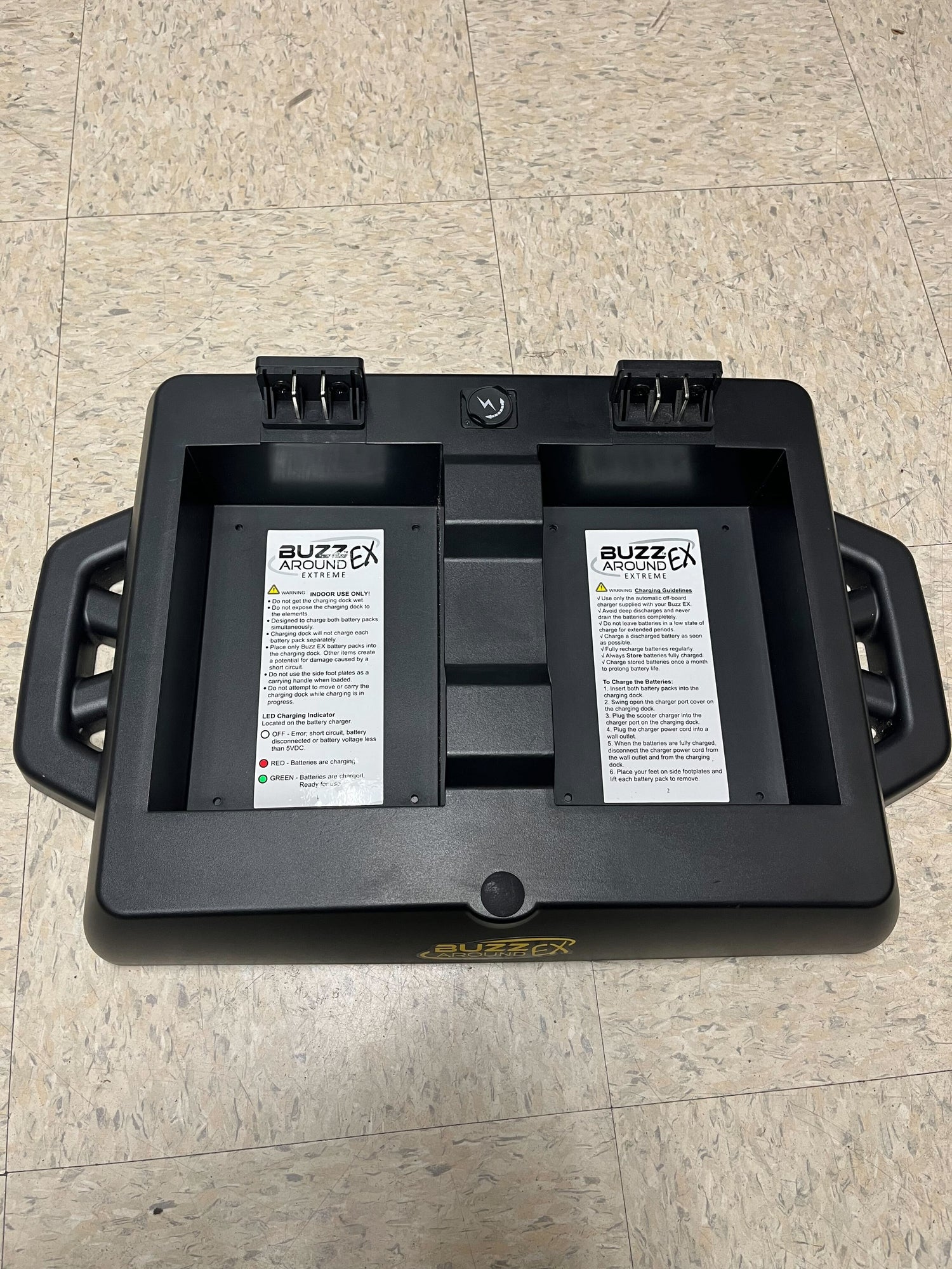 Note: The charging dock is compatible with the Buzzaround EX (GB118/GB148) and Buzzaround LX (GB119/GB149) scooters only. It will not accept loose batteries or the battery boxes from any other models.