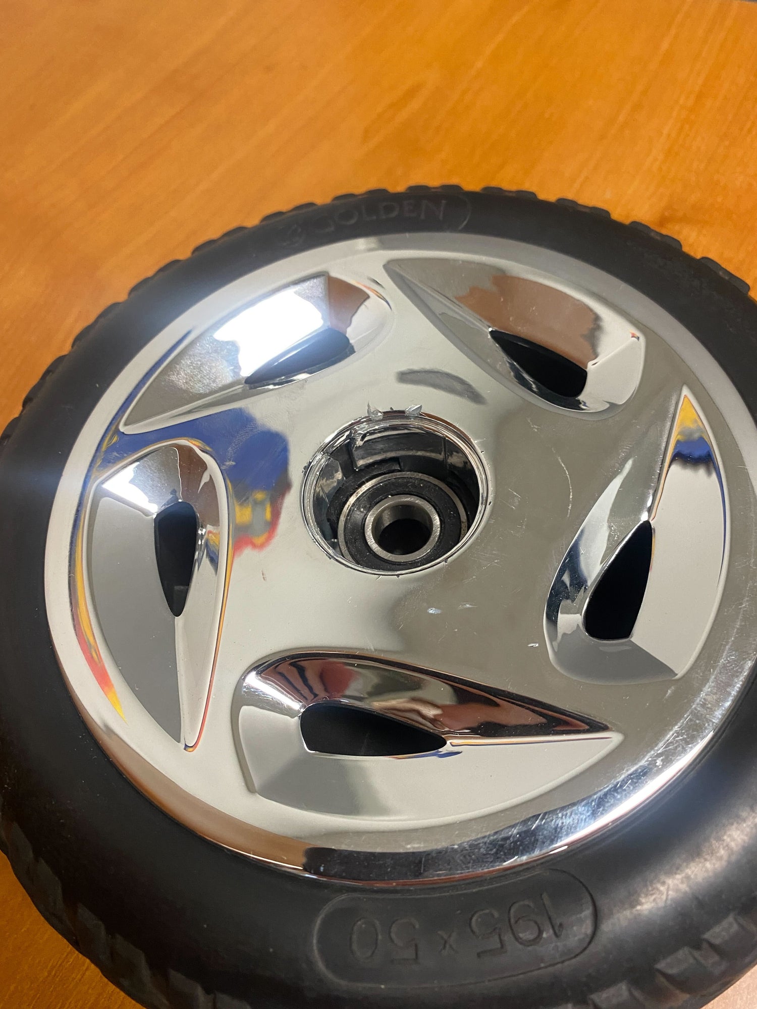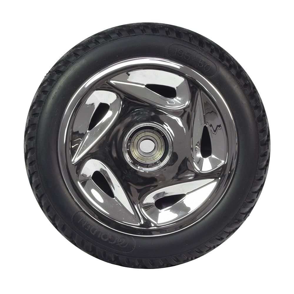 Monster Scooter Parts has these 8” (195x50) low profile, non-marking black tires mounted on a highly polished hubcap and rim. The tread design is exclusive to Golden Technologies, and looks great on the front of a scooter.