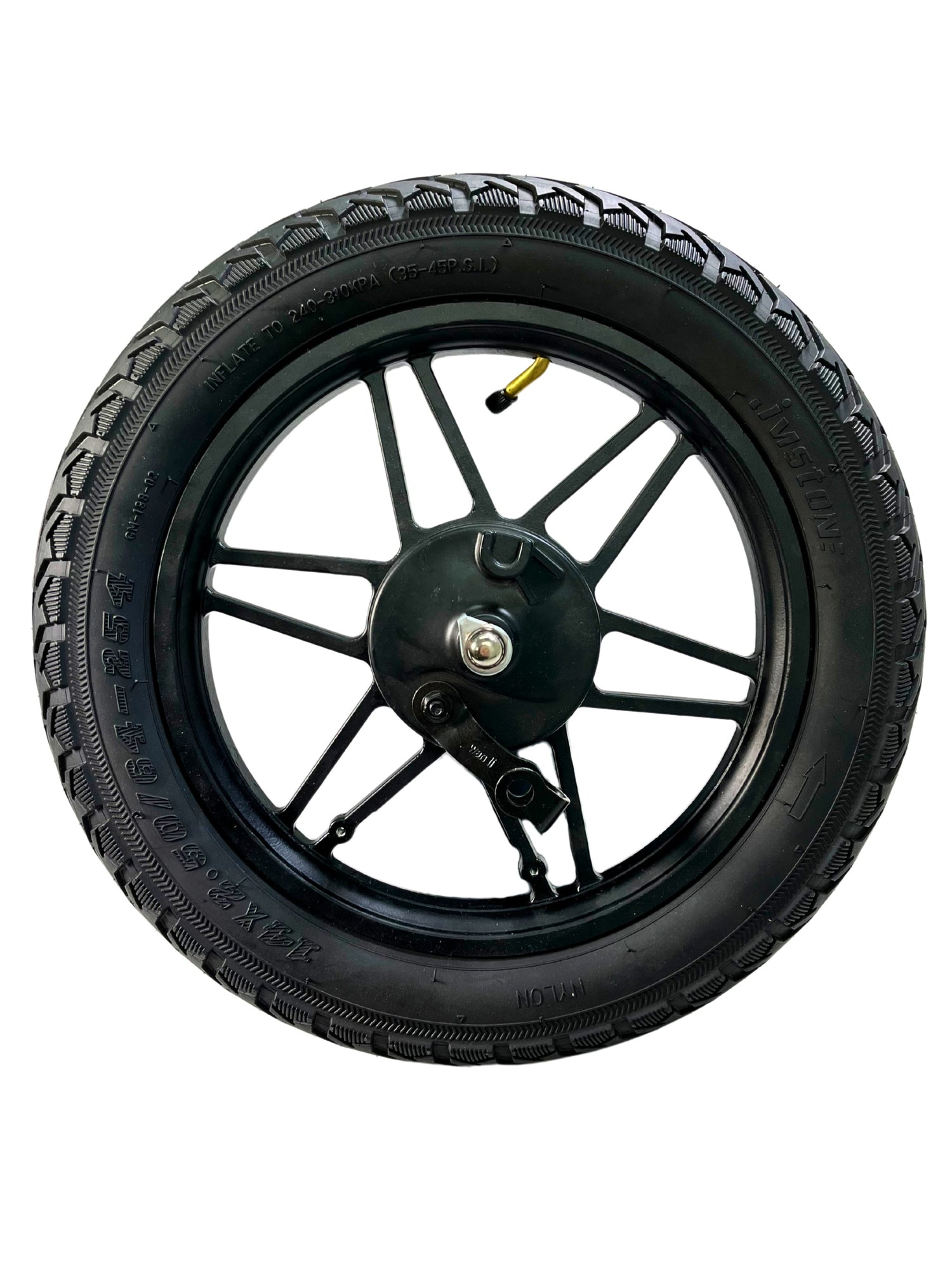 The front wheel assembly for the GOTRAX Flex electric scooter comes complete with the rim, inner tube, a 12-spoke rim, and a pneumatic 14"x2.50" (64-254) pneumatic tire. The tire sports a directional street tread and includes an inner tube with an angled Schrader valve.