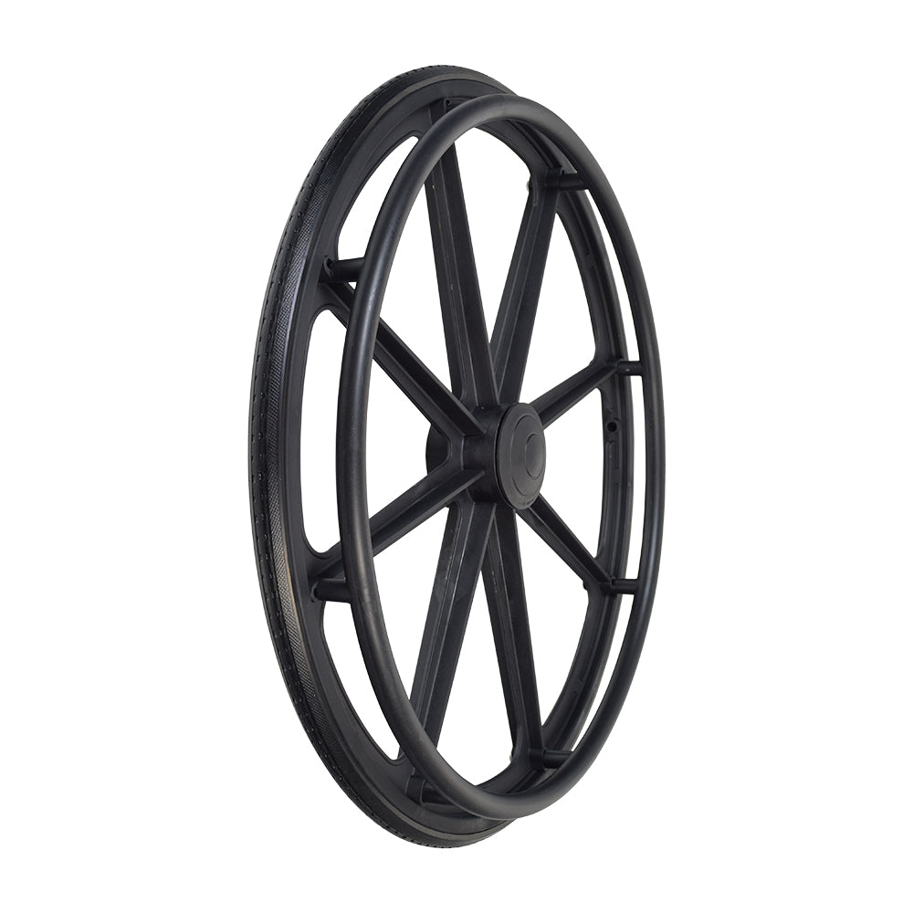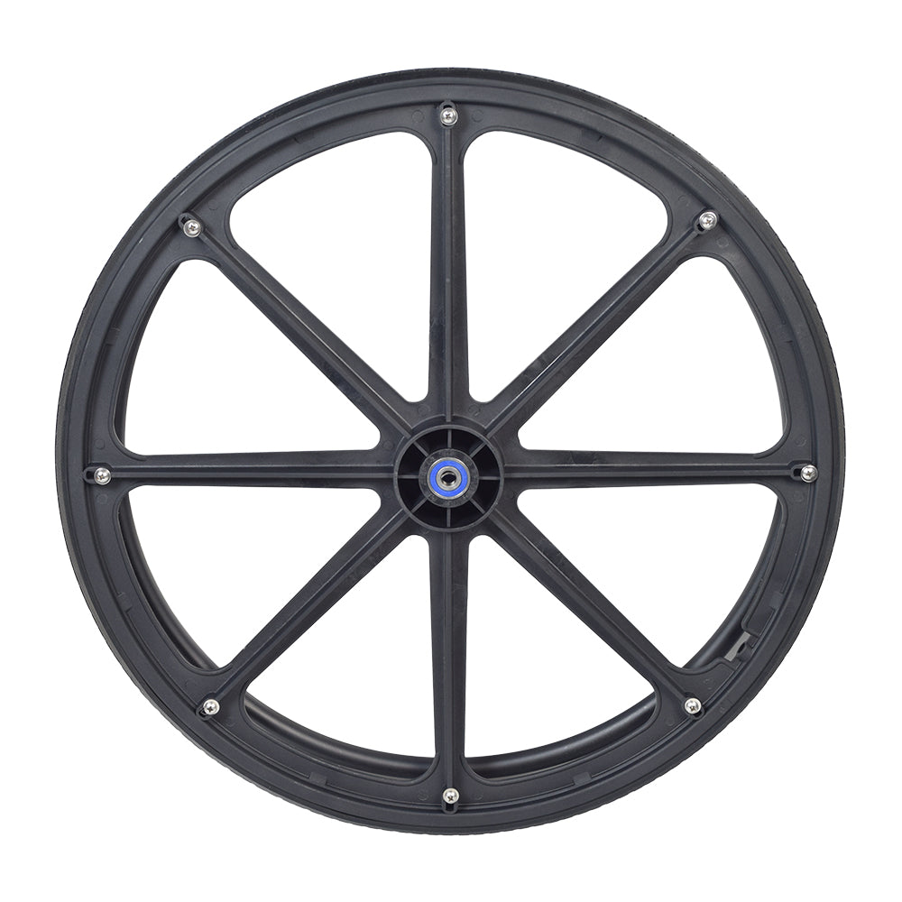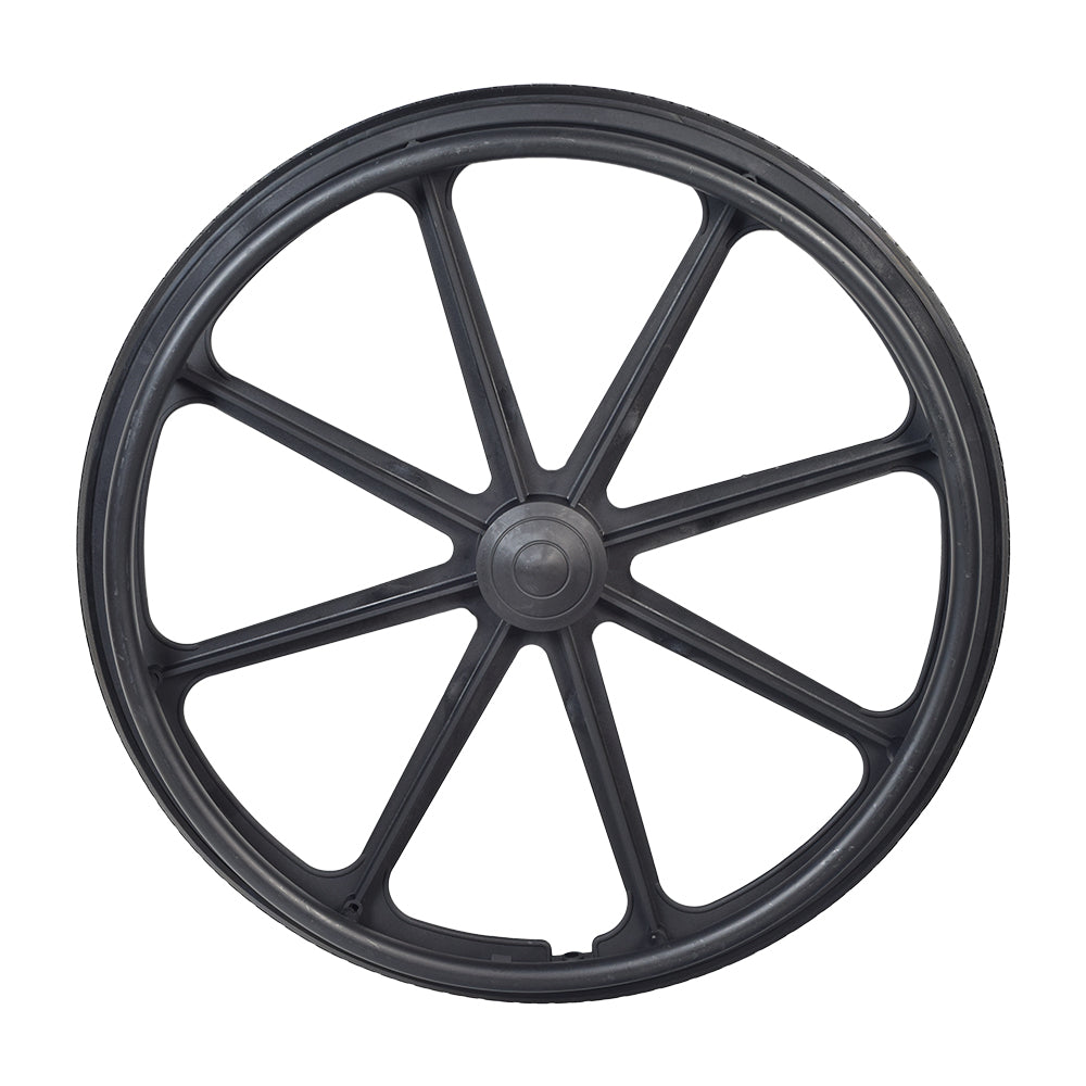 The 23" wheel assembly with handrim for the Invacare Mariner Shower Chair features a solid, treaded urethane tire.
