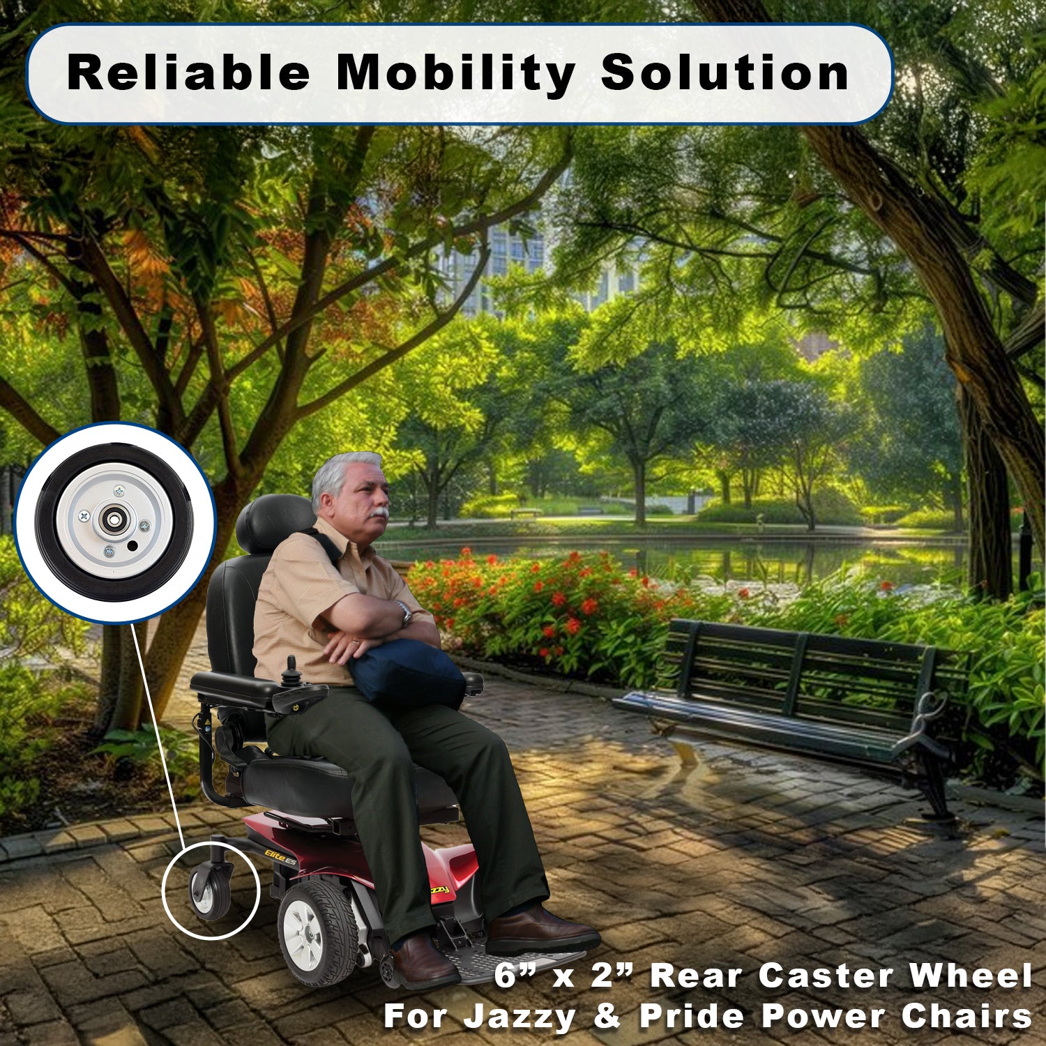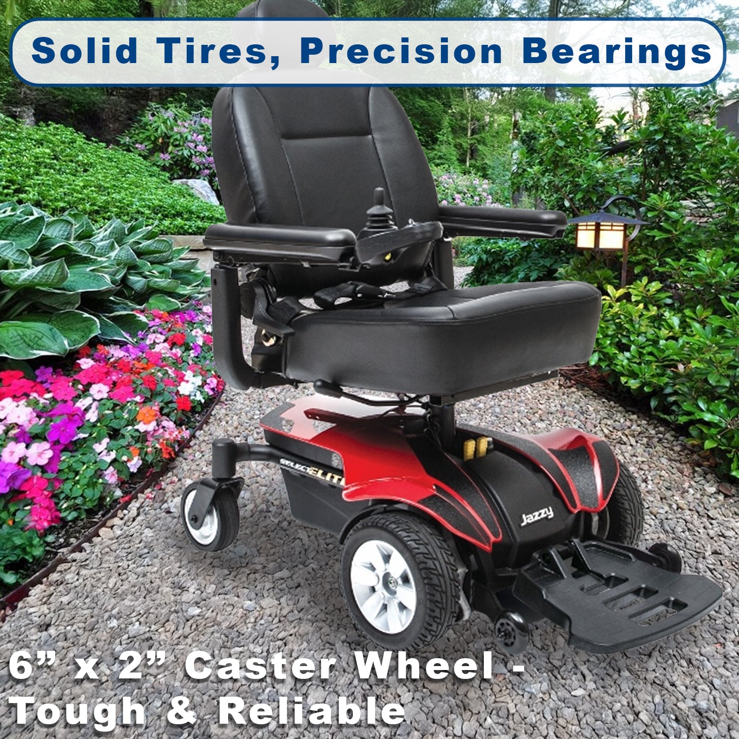 When you need a replacement 6"x2" black caster wheel for your Jazzy powerchair, Monster Scooter Parts is here with the best deals around. Here is a flat-free black rear caster wheel assembly for the Jazzy Select, Jazzy Select Elite, Pride TSS 300, and a few other electric power chairs. You can see the list of power chair models that use this caster wheel when you click on the Compatibility tab.