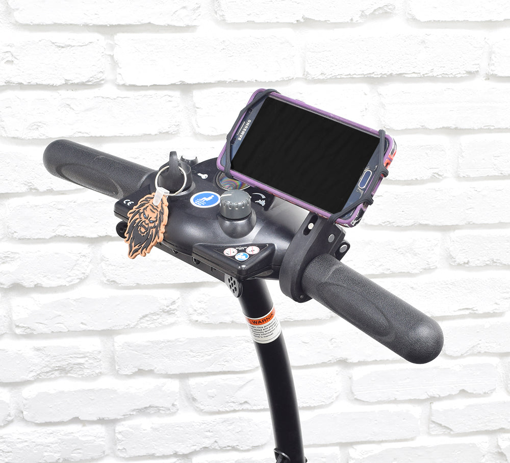 • This high-quality black holder really grabs your mobile phone with its rubber "claws" and keeps it tight and secure. And best of all; it will quickly mount on just about any and every handlebar, or armrest bracket used on bikes, scooters, wheelchairs, and power chairs today. With the holder's universal elastic rubber mounting setup, it is perfect for all of today's top brands and models
