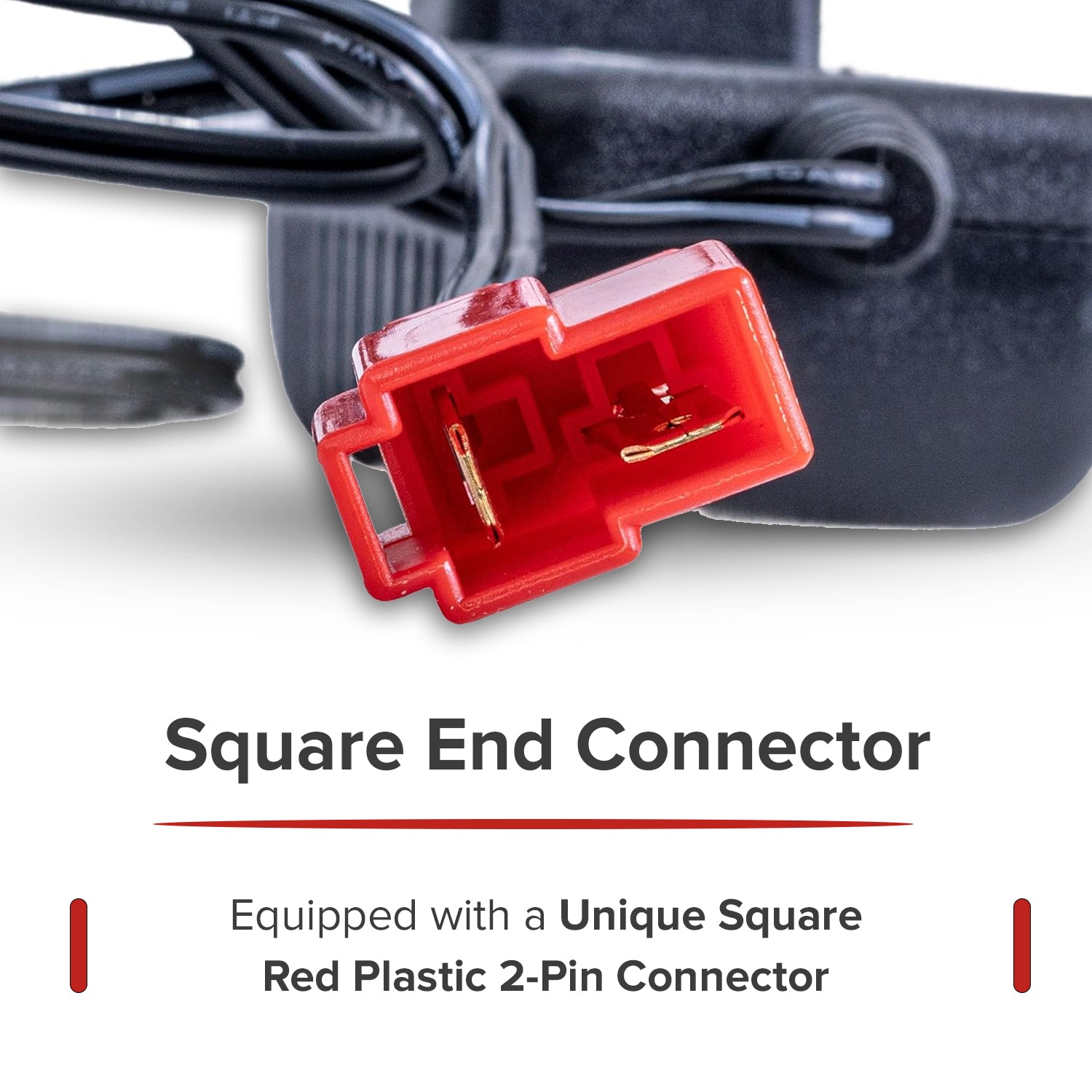 What makes this 1.0 amp charger so special is its connector. Unlike the round coaxial plug-in connector, this model uses a squarish red plastic appendage with 2-pin wiring.