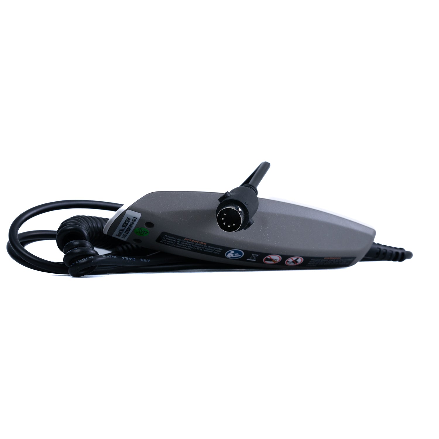 The standard hand control with a 24" extension on the connection cable for Pride Mobility lift chairs replaces and retrofits the earlier hand controls made by Limoss and the hand control with the separate control box. The unit uses a semi-round 5-pin connector as seen in the above photograph. This hand control raises the chair to the standing position, and lowers it into the recline positions.