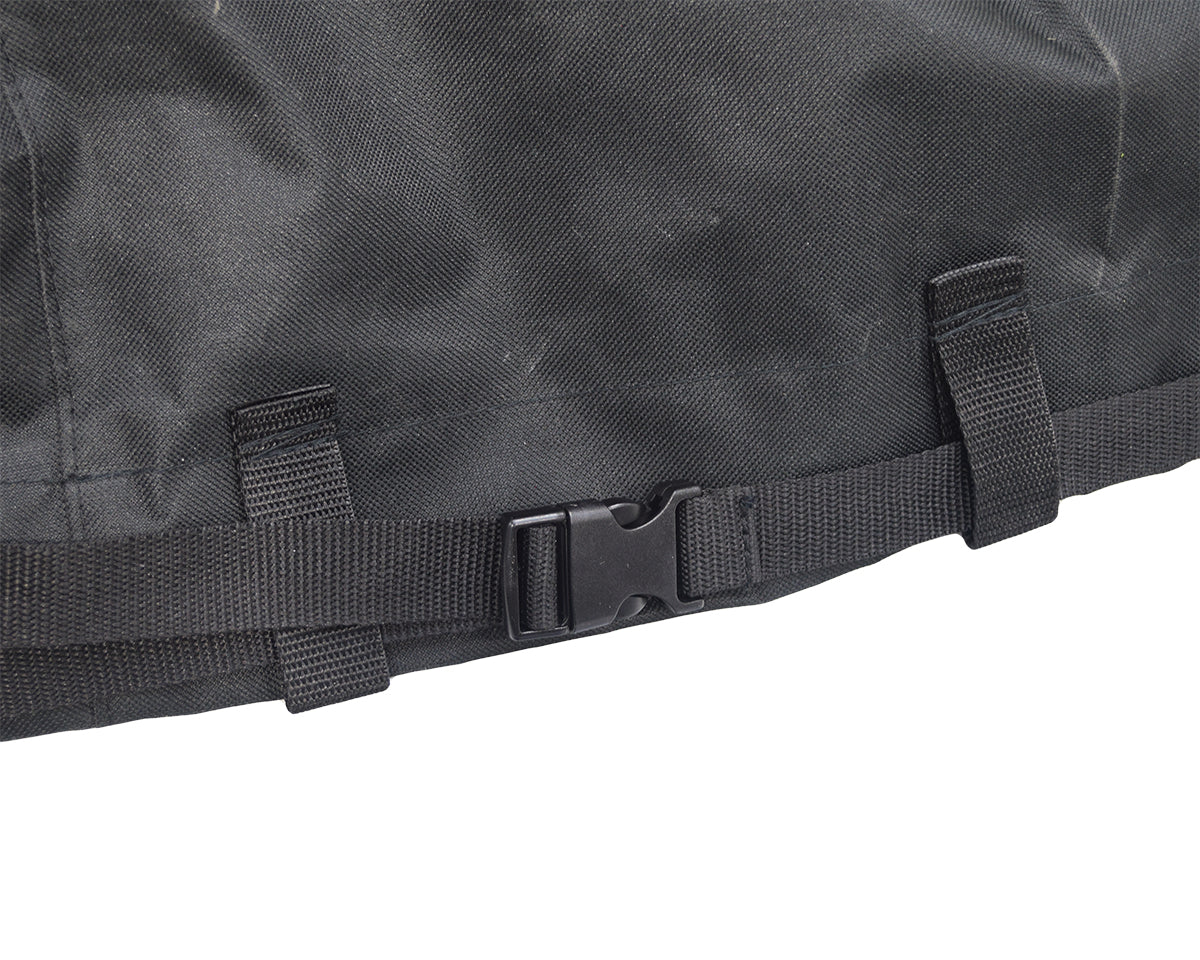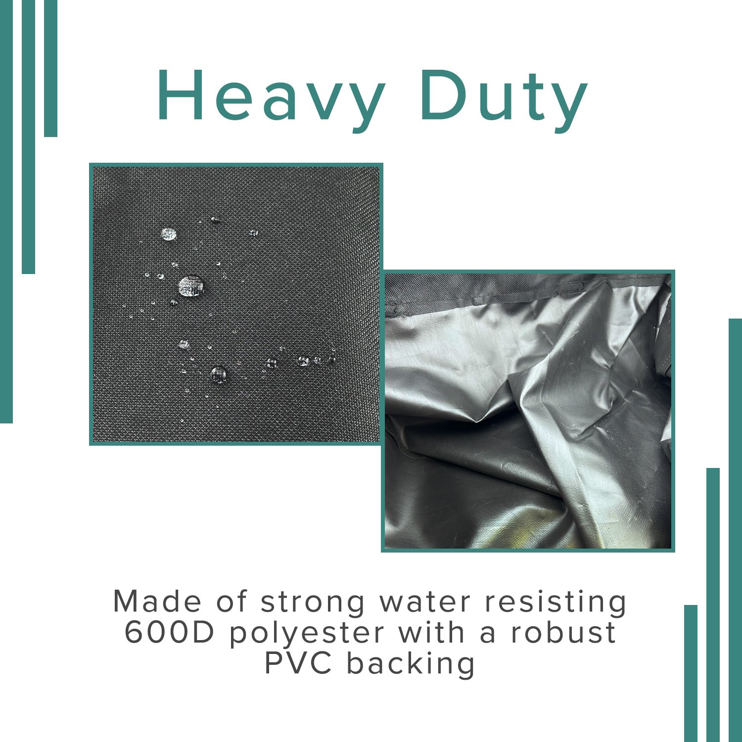 Our heavy-duty 600D polyester weatherproof cover with PVC rubber backing, is ideal for daily protection from elements. Weatherproof means this is water resistant and not waterproof, so we recommend not allowing water to pool on cover.