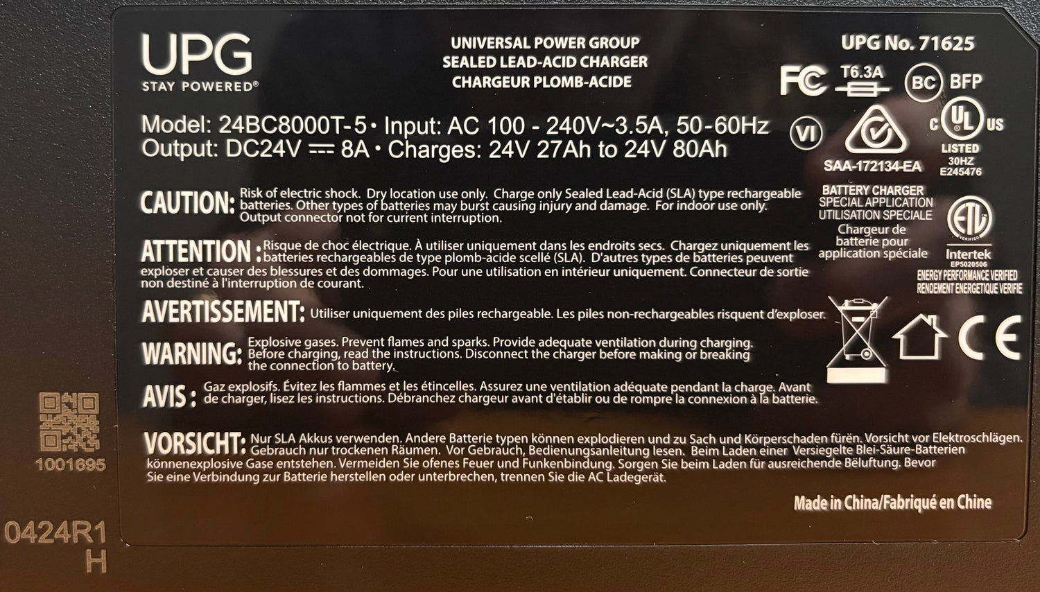 This 24 volt 8 amp XLR 24BC8000T-4 battery charger is no lightweight plastic contraption. This charger for Gel and Absorbed Glass Mat (AGM) batteries is made by Universal Power Group (UPG), a very respected manufacturer of top-quality batteries and chargers for the medical and mobility industry. So trusted is this charger that Invacare offers it as original equipment on a number of their power chair models.