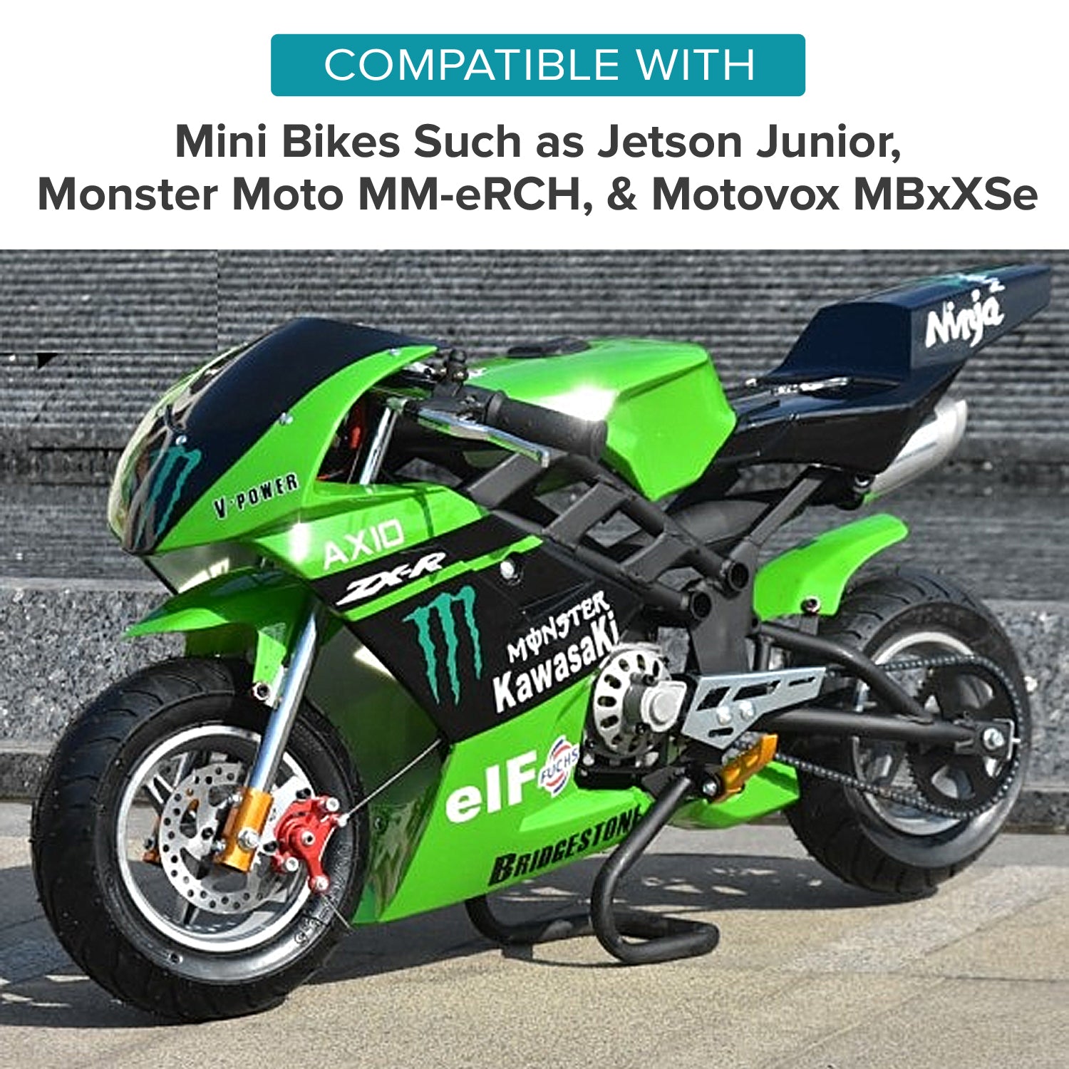 The 110/50-6.5 tire for mini bikes is a common size for a number of mini pocket bikes such as the Jetson Junior, the Monster Moto MM-eRCH electric mini bike, the Motovox MBxXSe Micro-mini mike, and more.