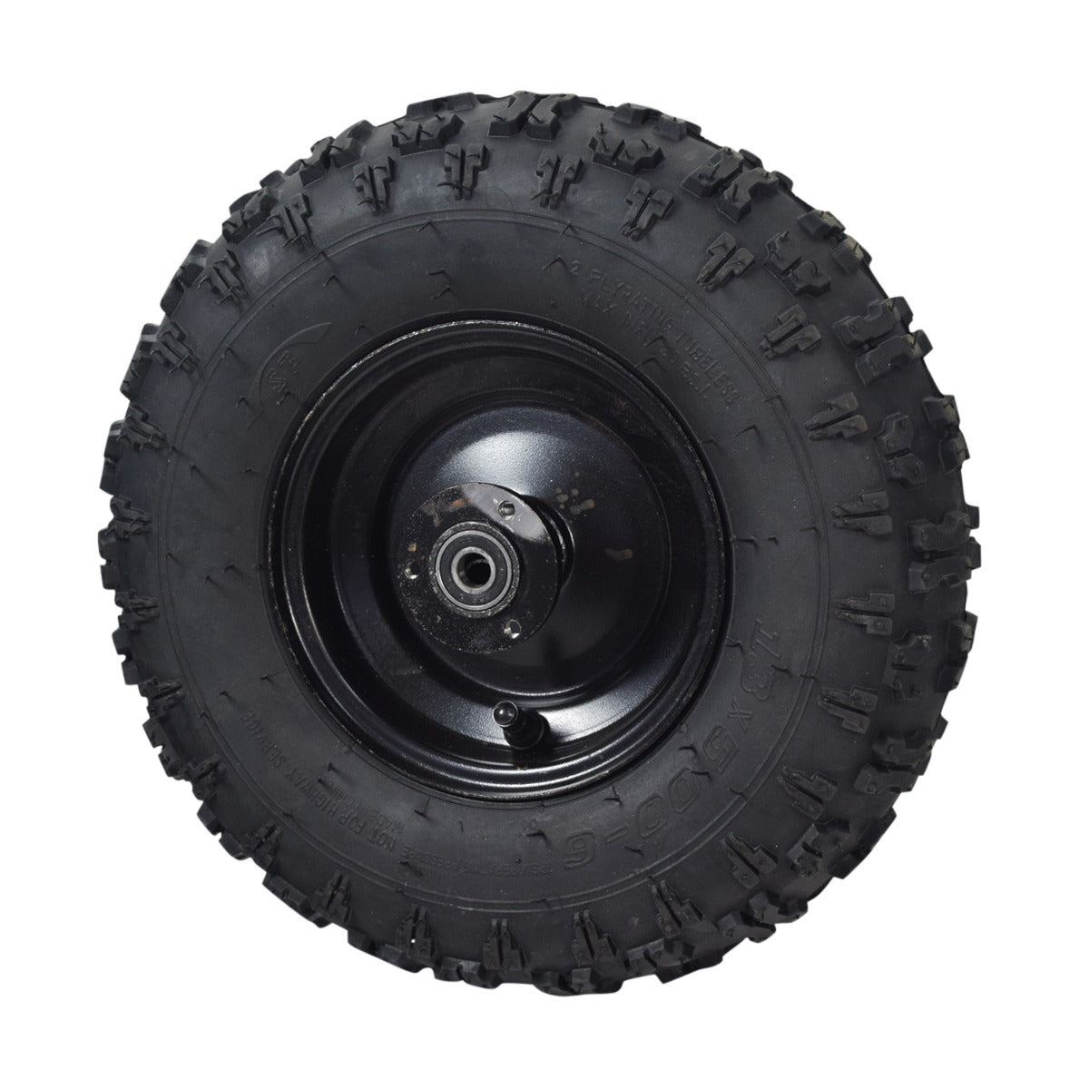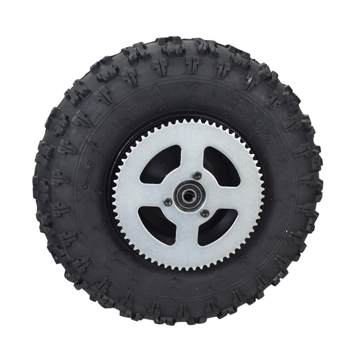This great wheel assembly for the DB003 mini bike comes complete with the 13x5.50-6 tire, pre-installed wheel bearings, 4-3/4" diameter brake disc, 64-tooth chain sprocket, and black enameled steel rim.
