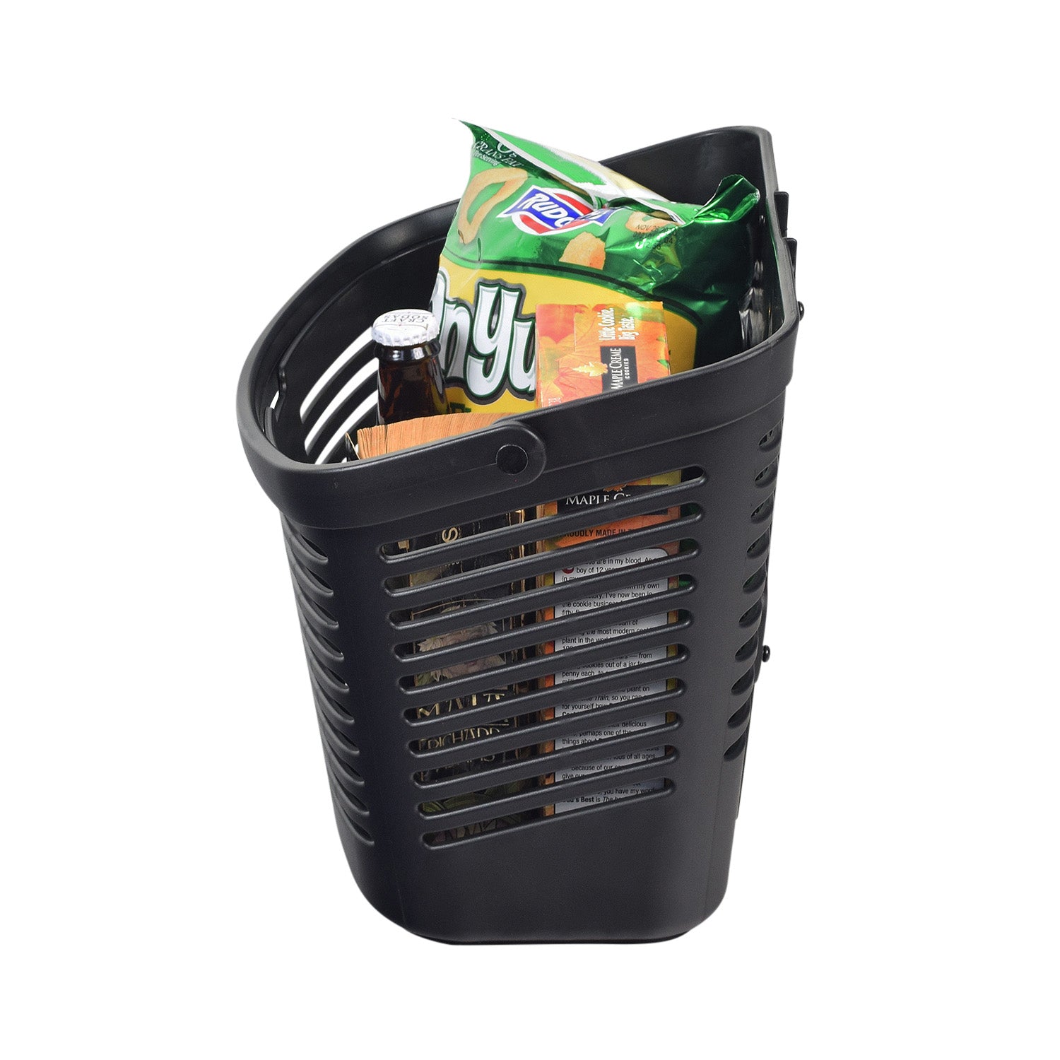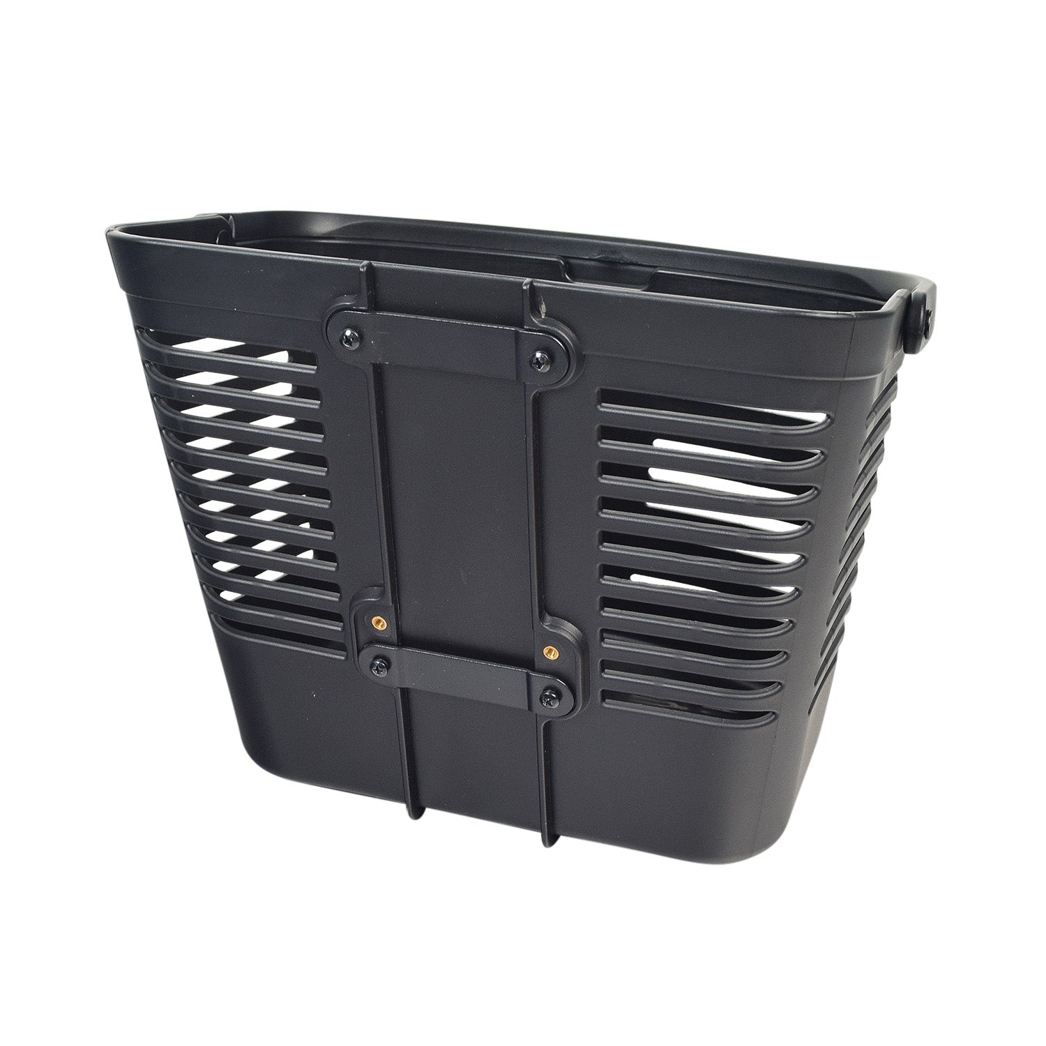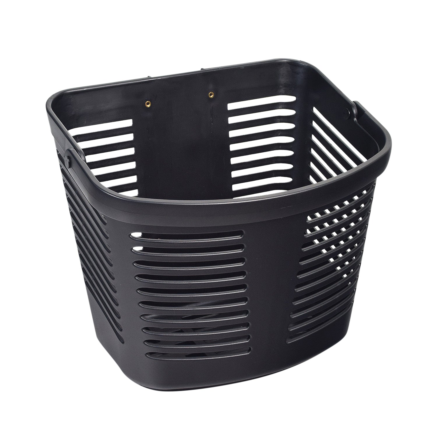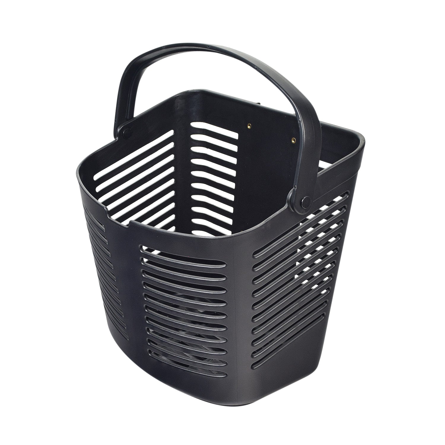 Black plastic basket with handle for the Pride Pursuit Sport, Pursuit (SC713), Victory 10 (SC610/SC710), and several other mobility scooters. This basket mounts on the front of the tiller.