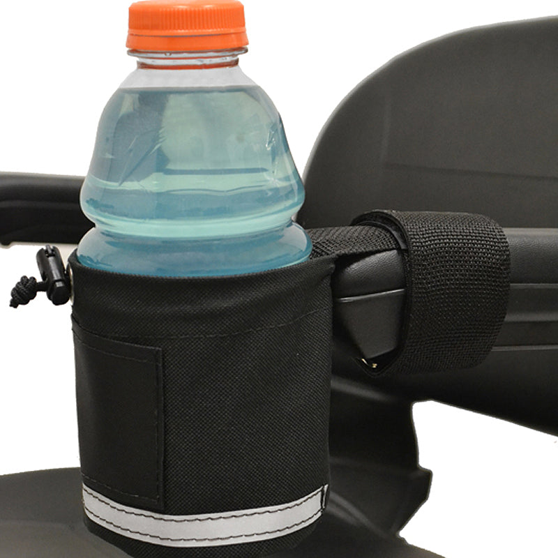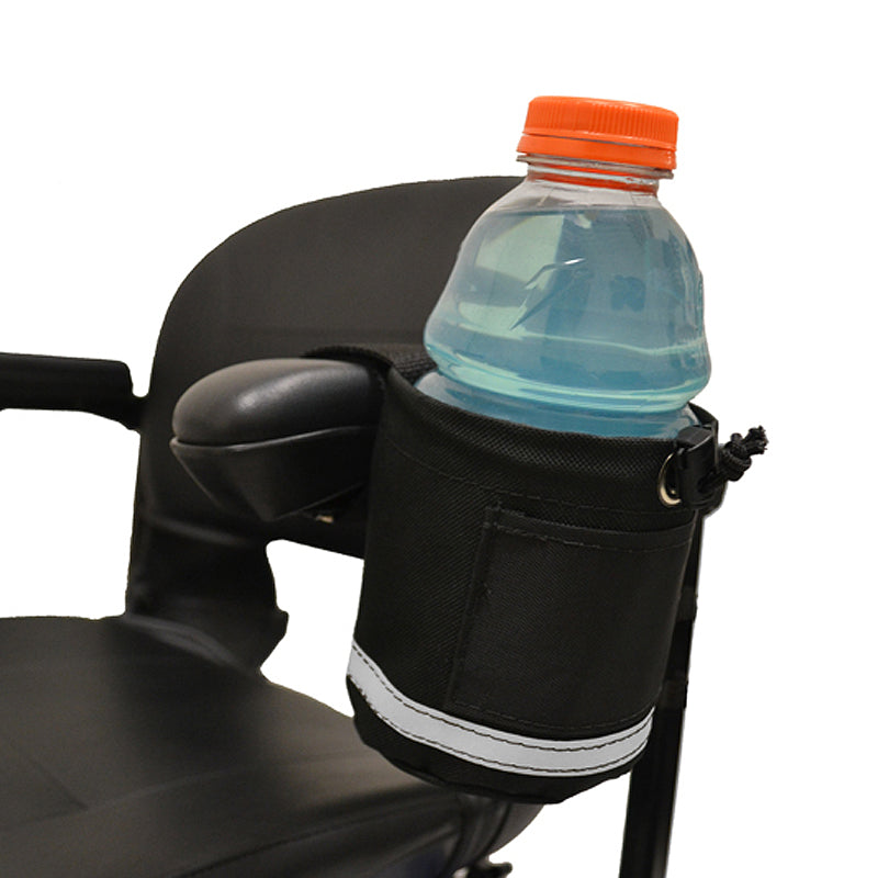 You don't need to spend a lot for a brand name cup holder that will soon break. These unbreakable fabric cup holders work perfectly on wheelchairs, mobility scooters, power chairs, and just about anything with an armrest. is much more durable than your standard garden variety plastic cup holder. The tough black nylon fabric used is water resistant too, so don't worry about spilling your drink on the cup holder. )